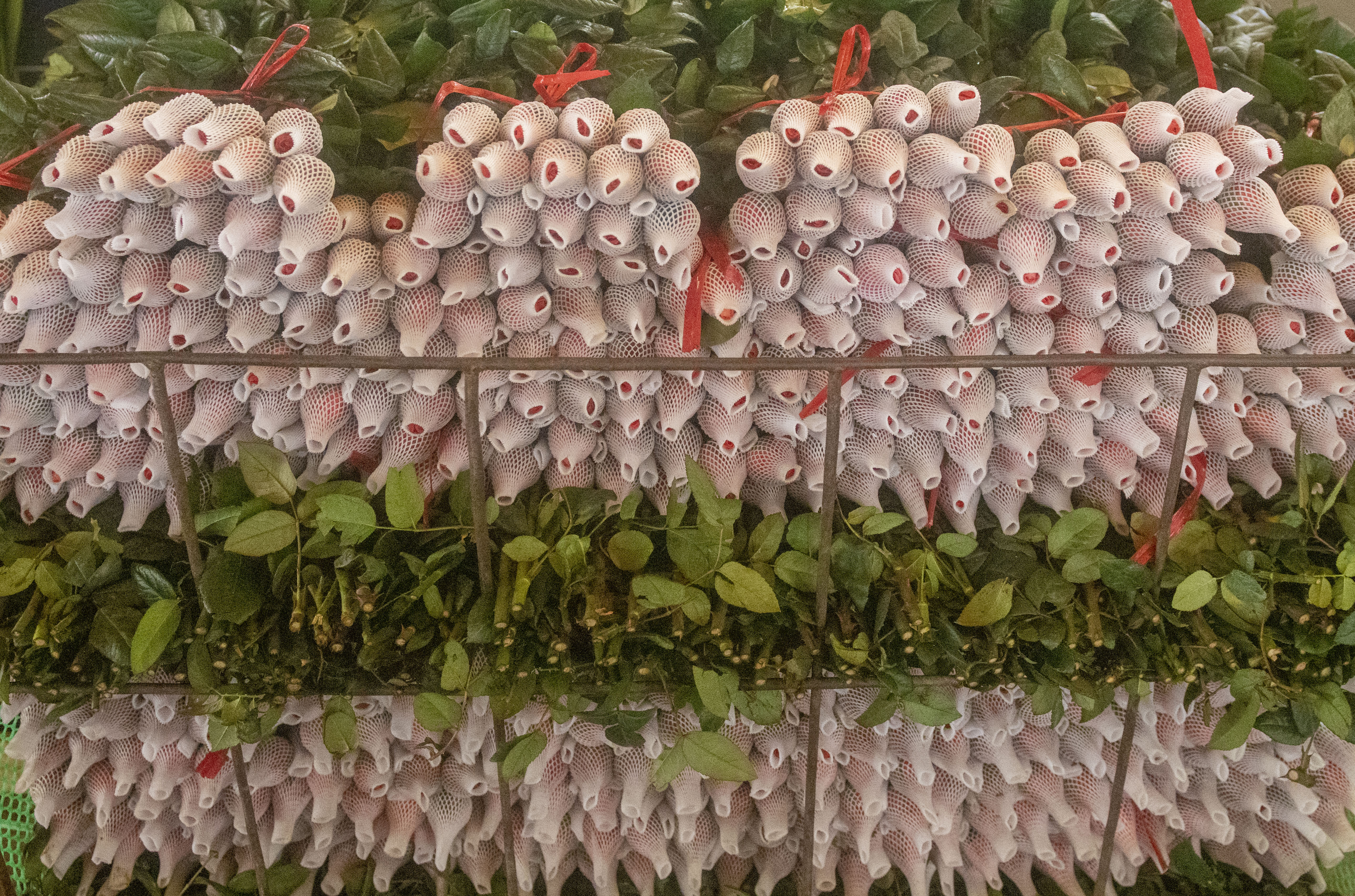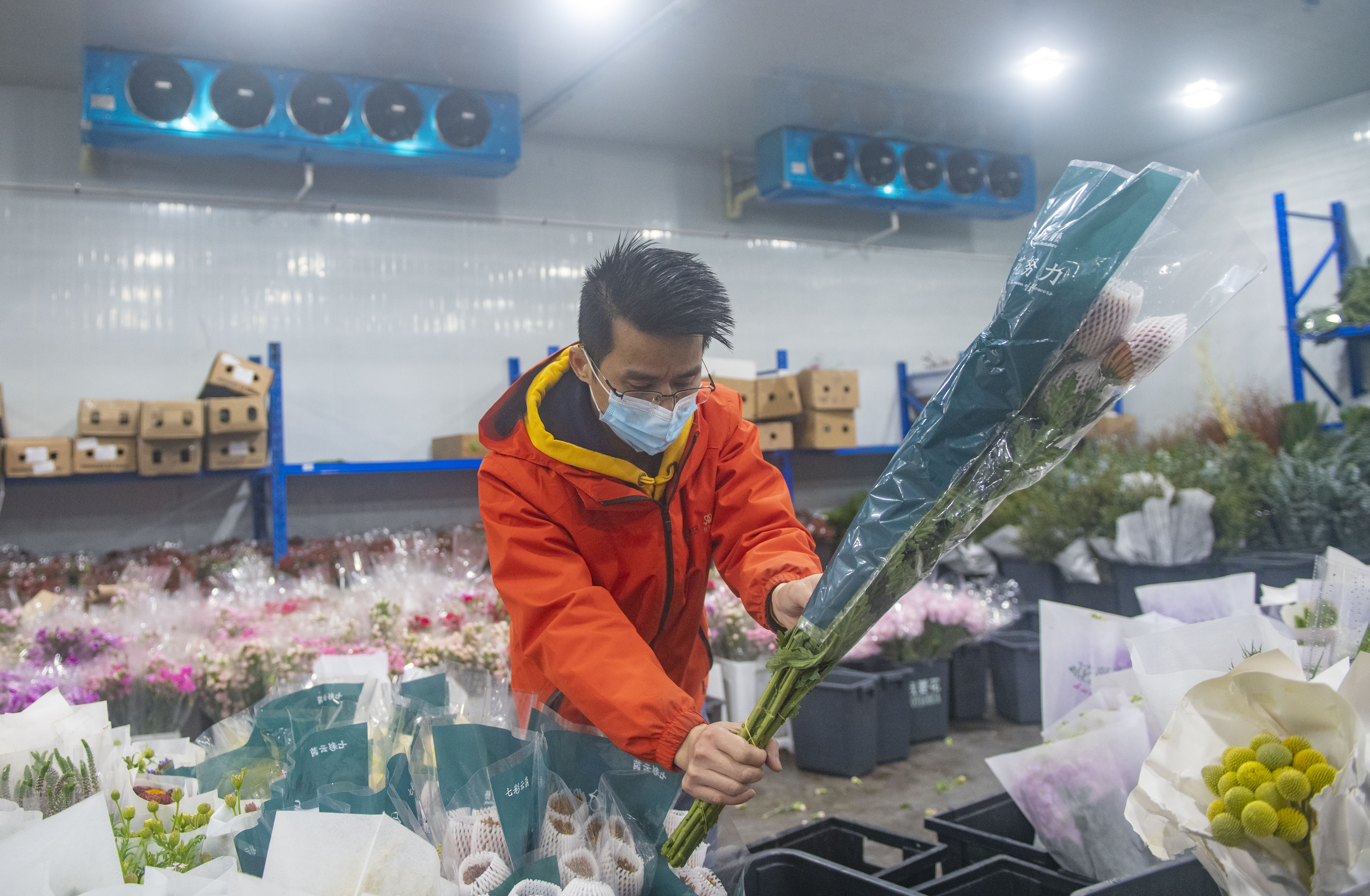 而在岭南花卉市场的保鲜冷库里,来自肯尼亚等地的进口玫瑰被2 °C的低温呵护,工作人员告诉记者,这些玫瑰1扎20枝的批发价起码在两三百元。
