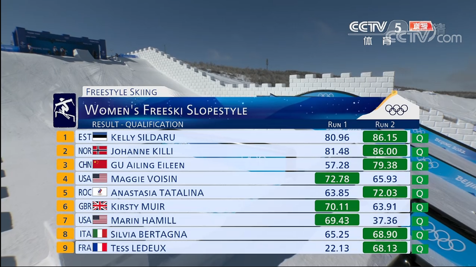 谷爱凌的最大竞争对手,来自爱沙尼亚的希尔达鲁则两轮得分都超过80分,其中第二轮得到86.15分,以第一的身份晋级。这是两人在本届冬奥会的第二次较量,此前在大跳台中,夺冠热门希尔达鲁却在资格赛中严重失误,无缘决赛。此番再次比拼,希尔达鲁显然志在夺冠。