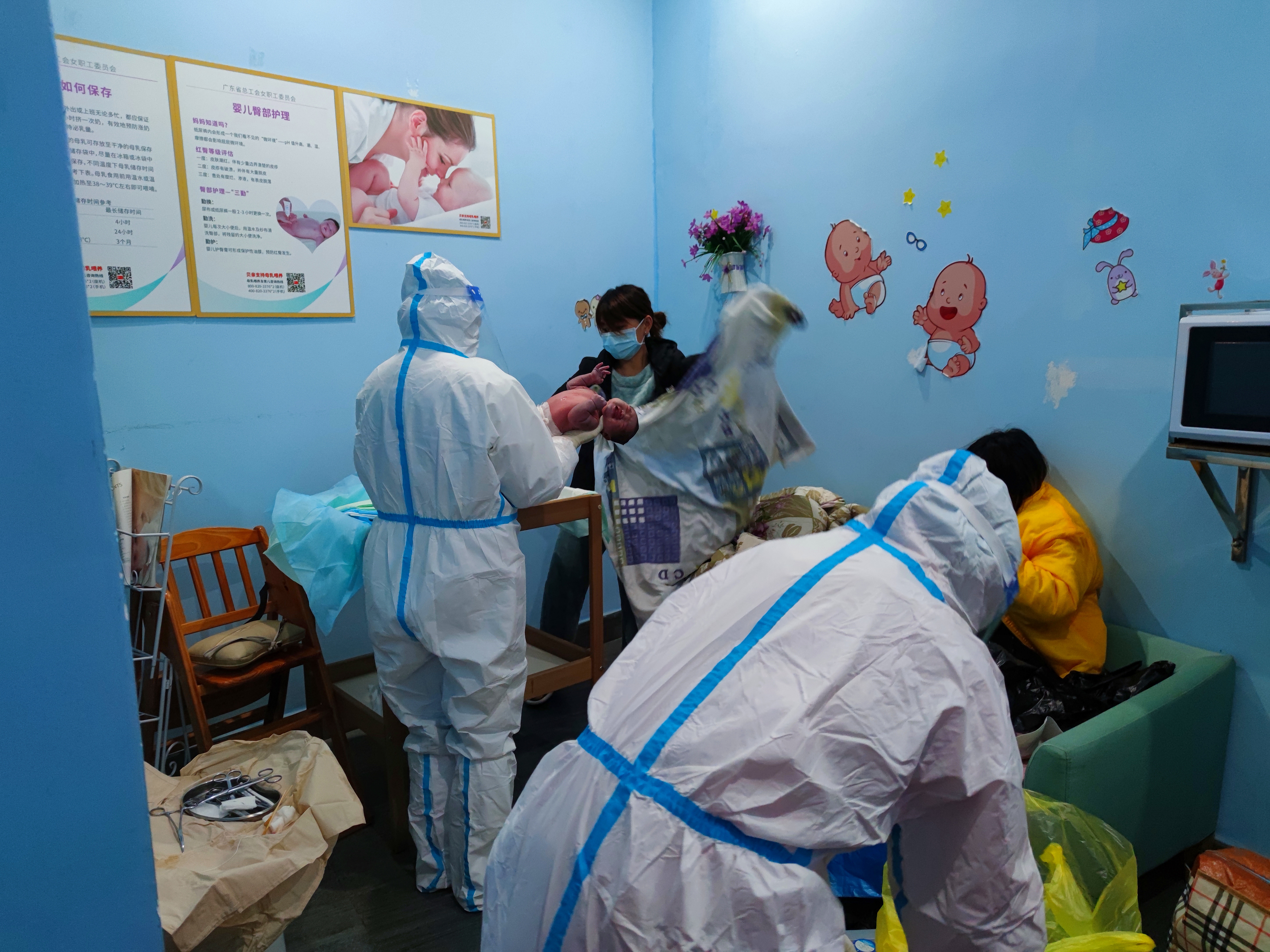 曾德英与医护人员在葵洞服务区母婴室照顾女婴。