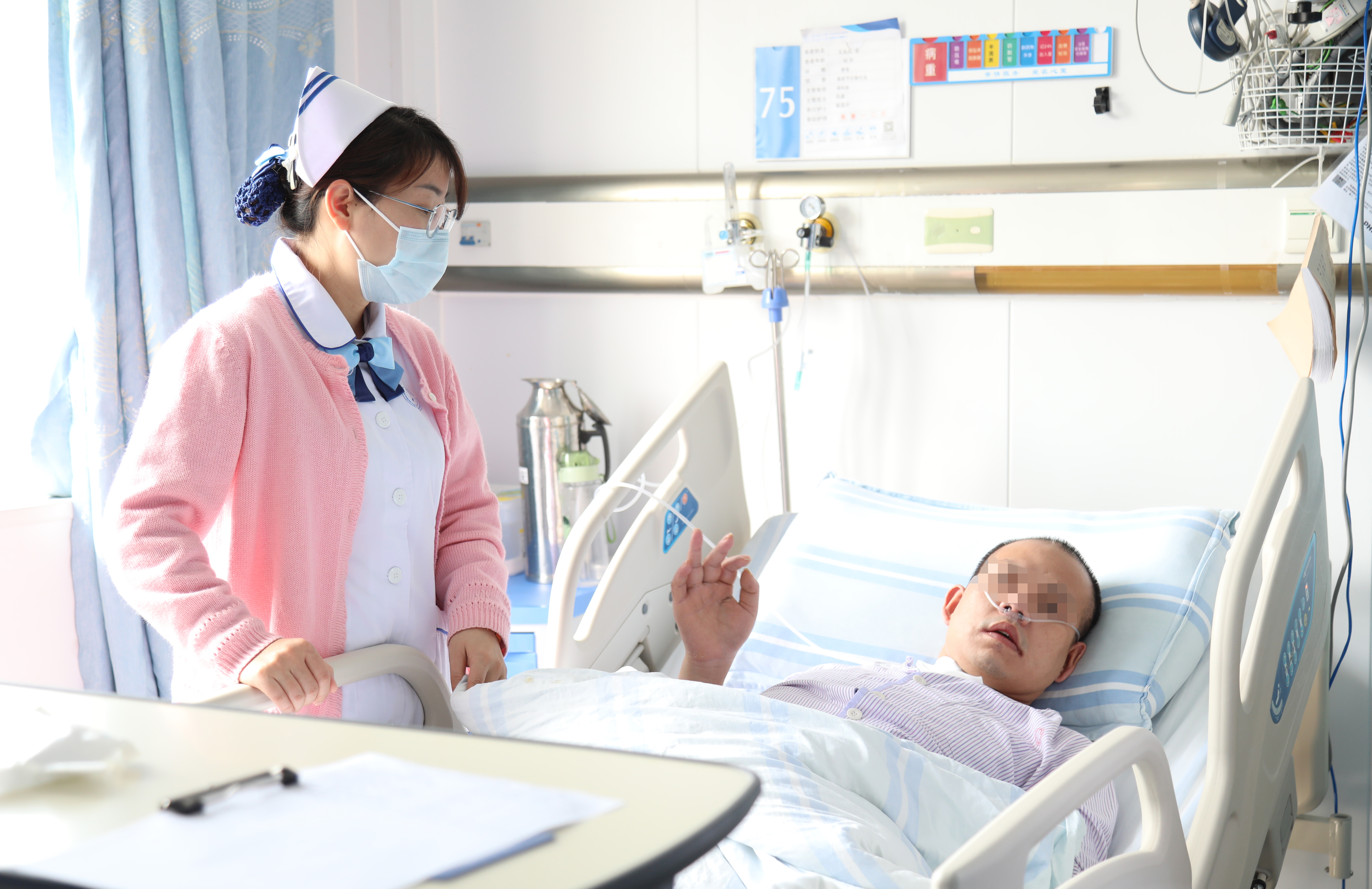 手术后的“无名氏”情况稳定,经过在神经外科重症监护病房近一月的护理,意识逐渐清醒。“这个年轻人没有家人陪伴,在ICU病房也会时间意识比较模糊,短时间还缺失了一些记忆。护士姑娘们每天都会在他耳边呼唤他,跟他说话,告诉他现在是什么日子,比如:快过年啦,你想不想早点治好病回家呀?你想吃些什么?告诉我;你叫什么名字?家在哪里,家里有什么人?……”神经外科邓榆姝副护士长回忆说。