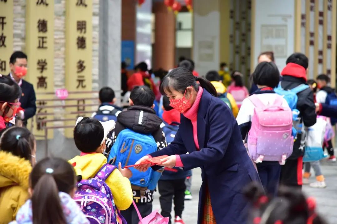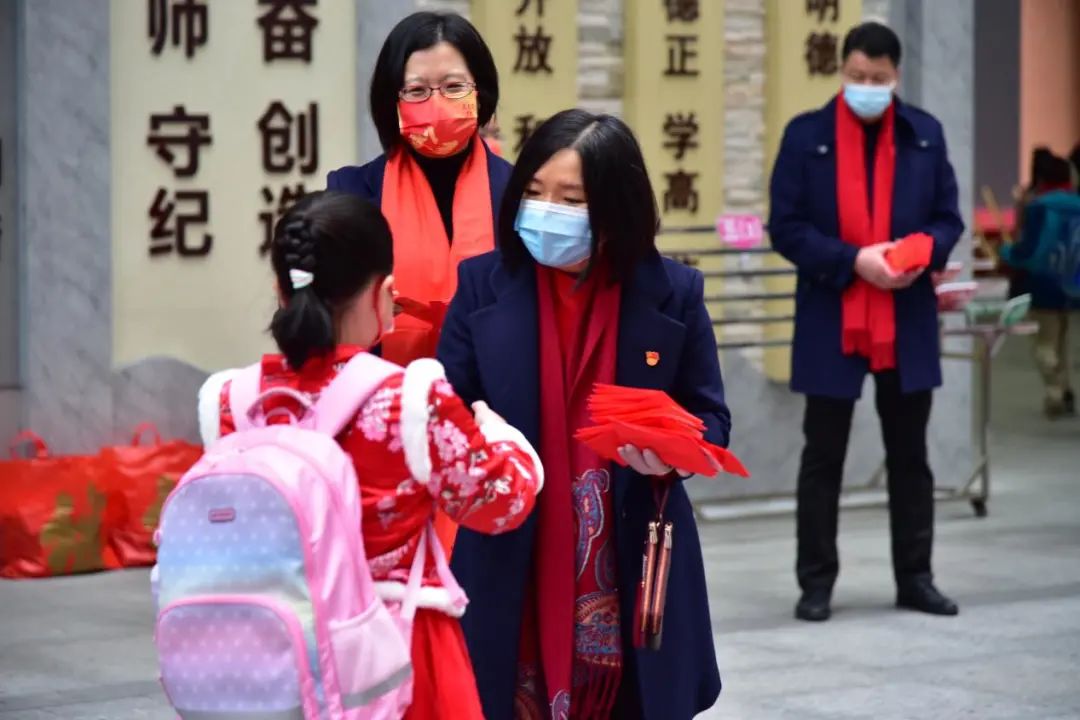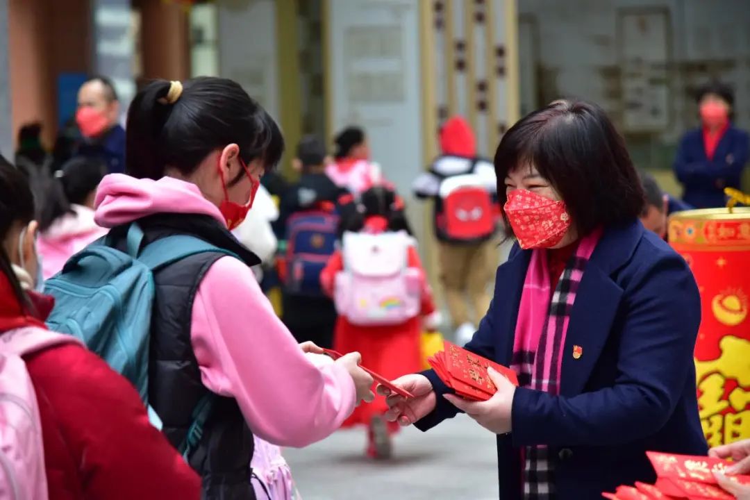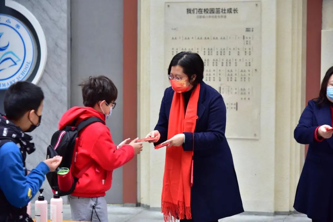 壬寅新年至,福虎踏春来。伴随着春天的脚步,崭新的2021学年第二学期如约而至。2月14日,旧部前小学的校长、老师们一大早就来到校门口迎接学生“回家”。同学们穿着喜气洋洋的服装,佩戴“虎头”装饰,精神抖擞、神采飞扬地踏进校园。学校全体行政班子更是精心为孩子们送上传统的“利是”:里面装有一把尺,寓意“旧部学子,百尺竿头更进一步”;一块巧克力,寓意学生学习灵巧、刻苦努力,勇夺“金牌”。