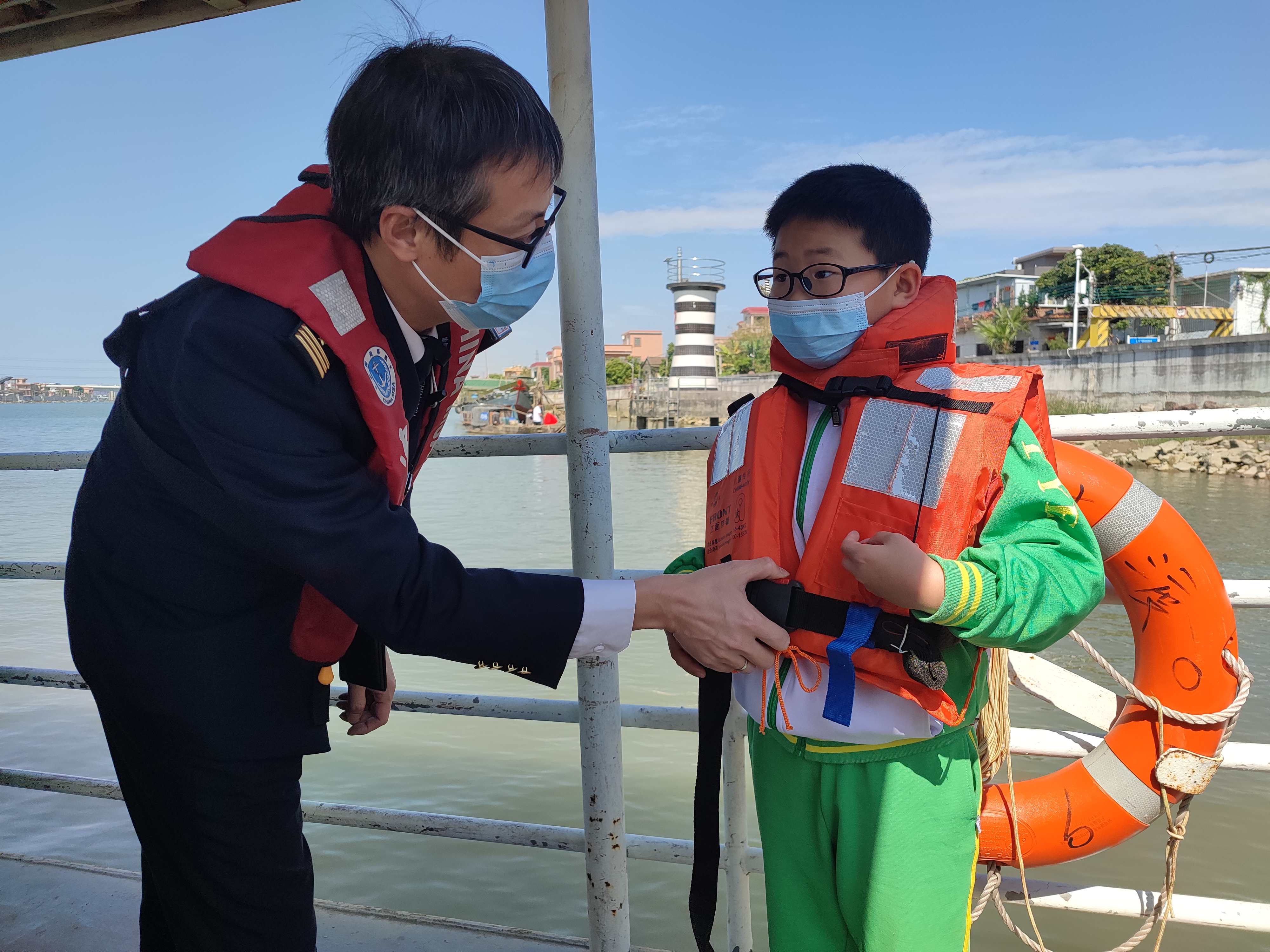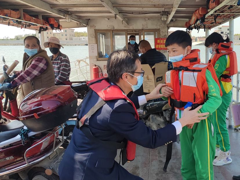 “今天是开学第一天,坐船上学一定要穿好救生衣!”2月14日开学第一天,一群身穿藏青色制服的海事执法人员在番禺区清流渡口维护渡运秩序,指导过渡的学生们穿好救生衣并宣传渡运安全知识,站好渡运“护学岗”。