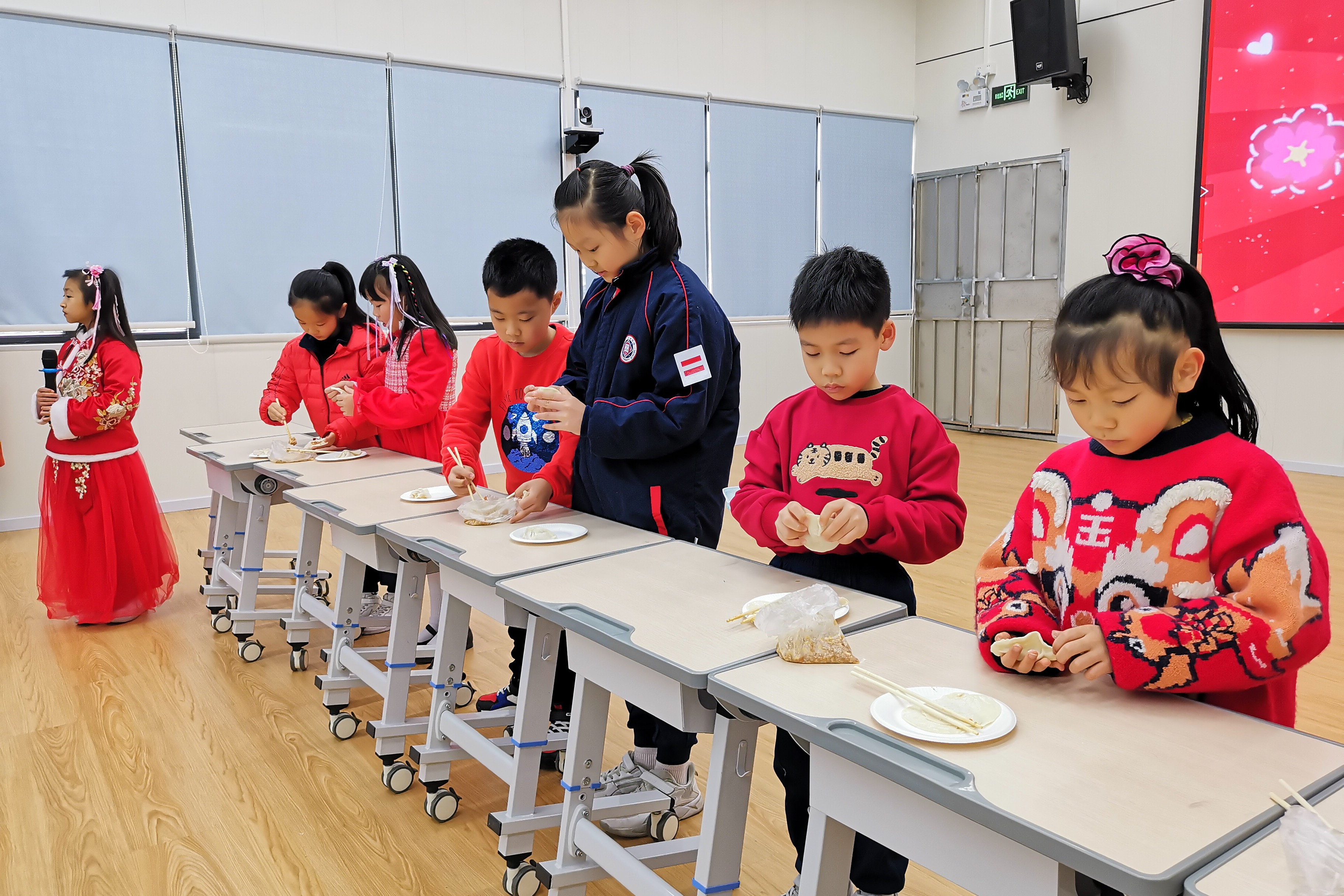 “五育并举饺饺者”,二年级学生、老师一起在台上包饺子,包住福运,年年好运气。