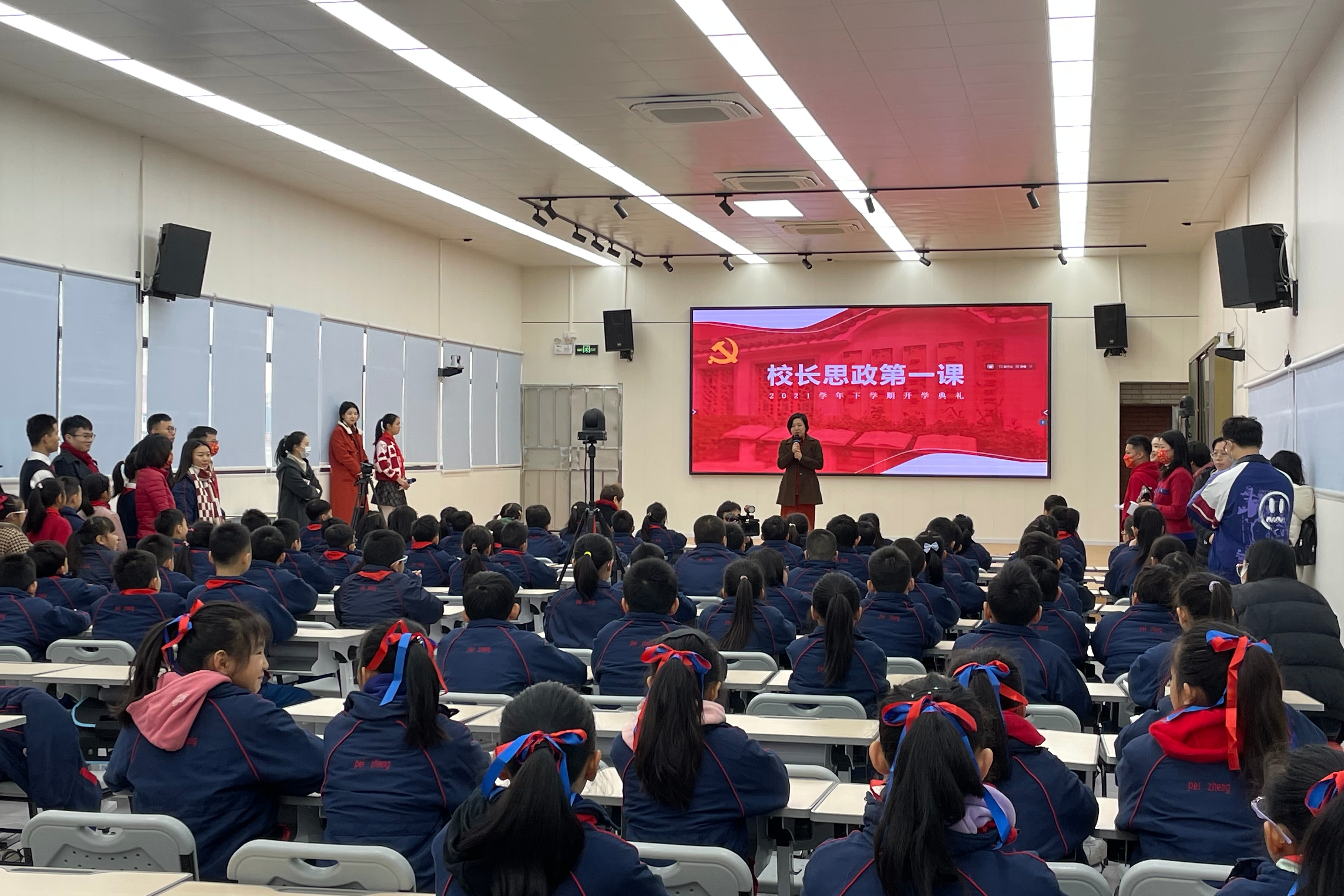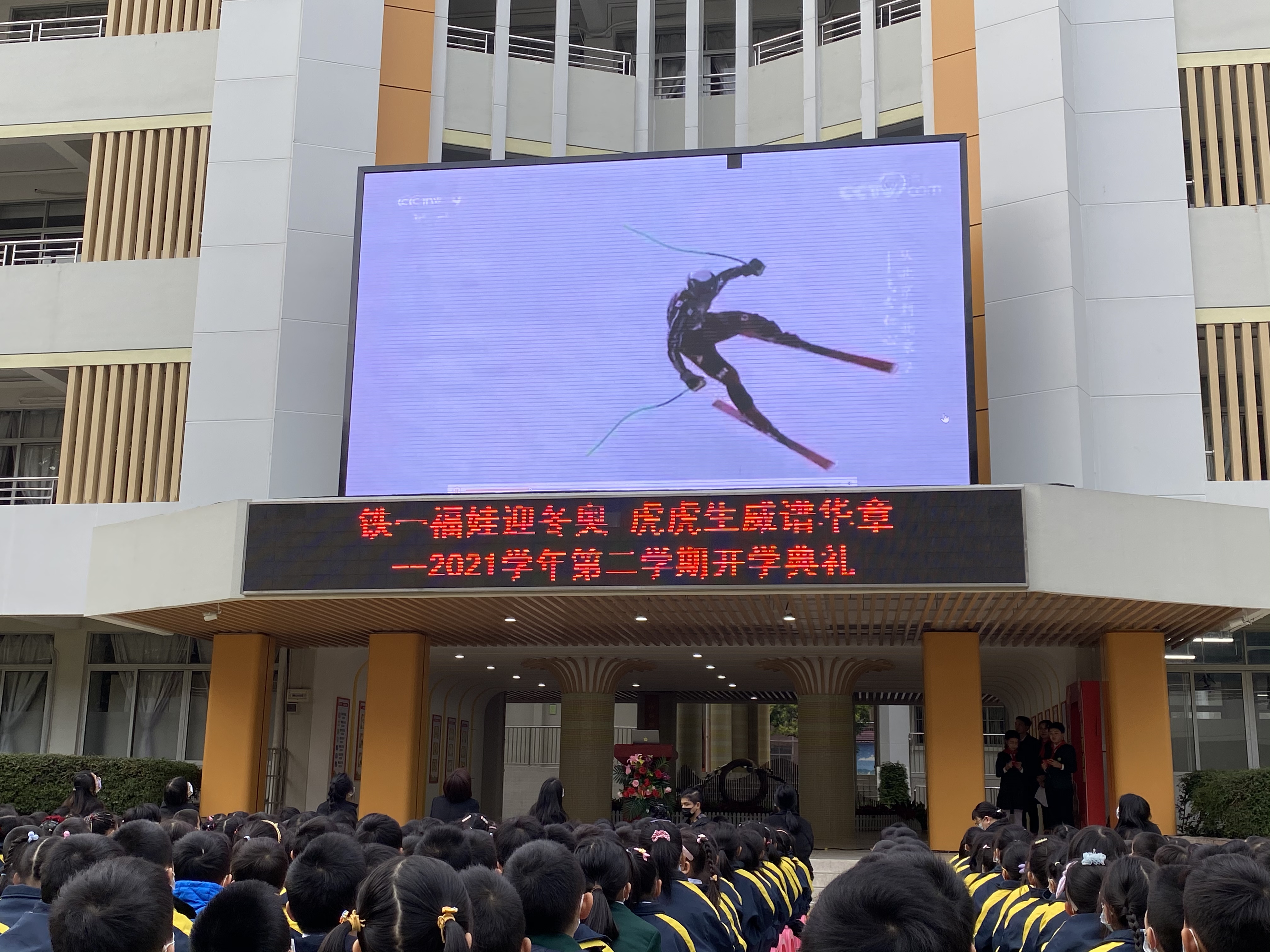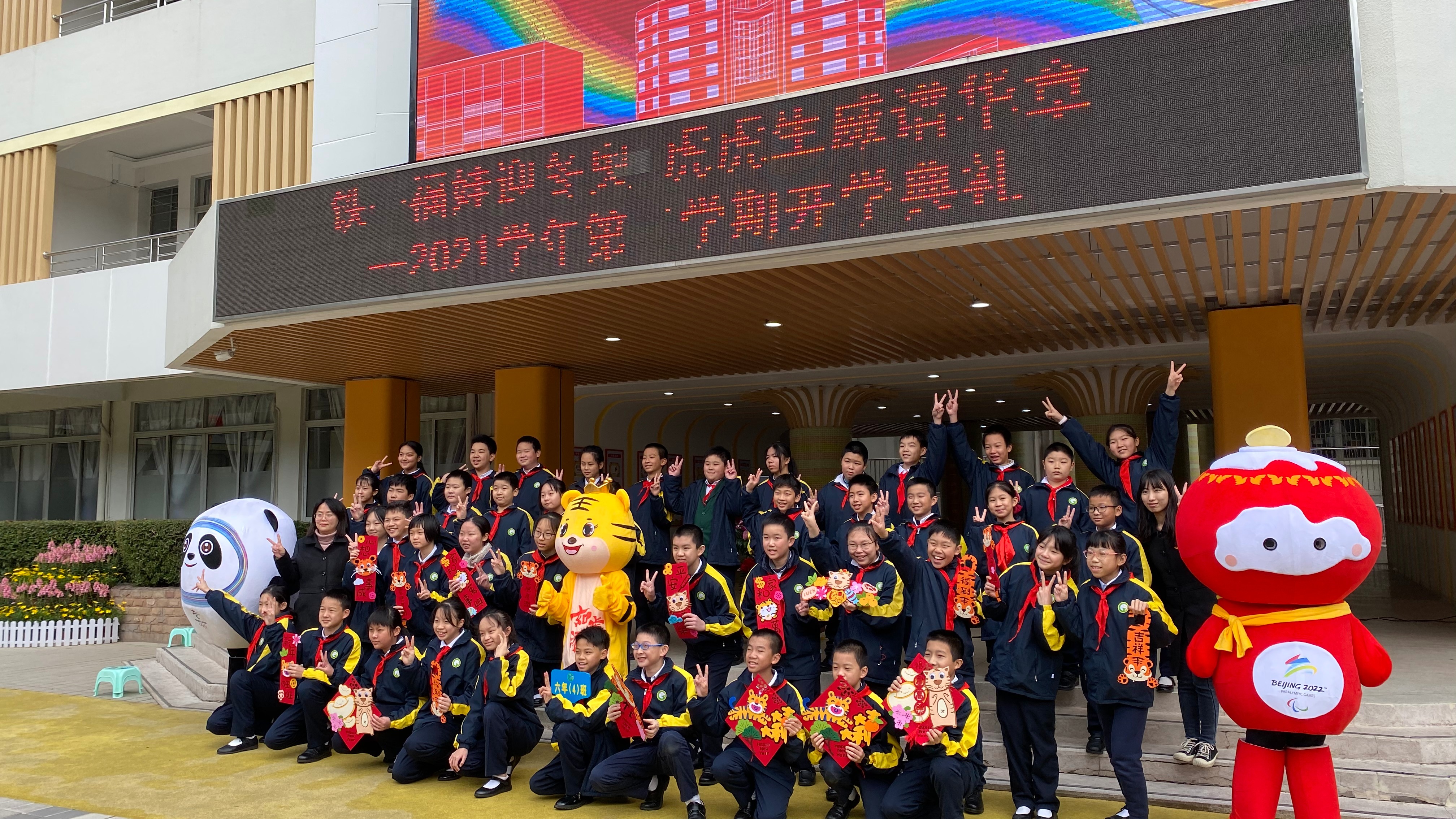 “同学们看冬奥会了吗?”“抢到冰墩墩了吗?”“知道冰墩墩是哪里的设计师设计的吗?”西关培正小学则在开学典礼上,由校长陈容给同学们带来校长思政第一课,祝愿同学们在学习上能发挥“更快、更高、更强、更团结”的奥林匹克精神,以虎虎生威的雄风、生龙活虎的干劲,享受学校的学习生活。学生准备了丰富的道具准备上场展示。