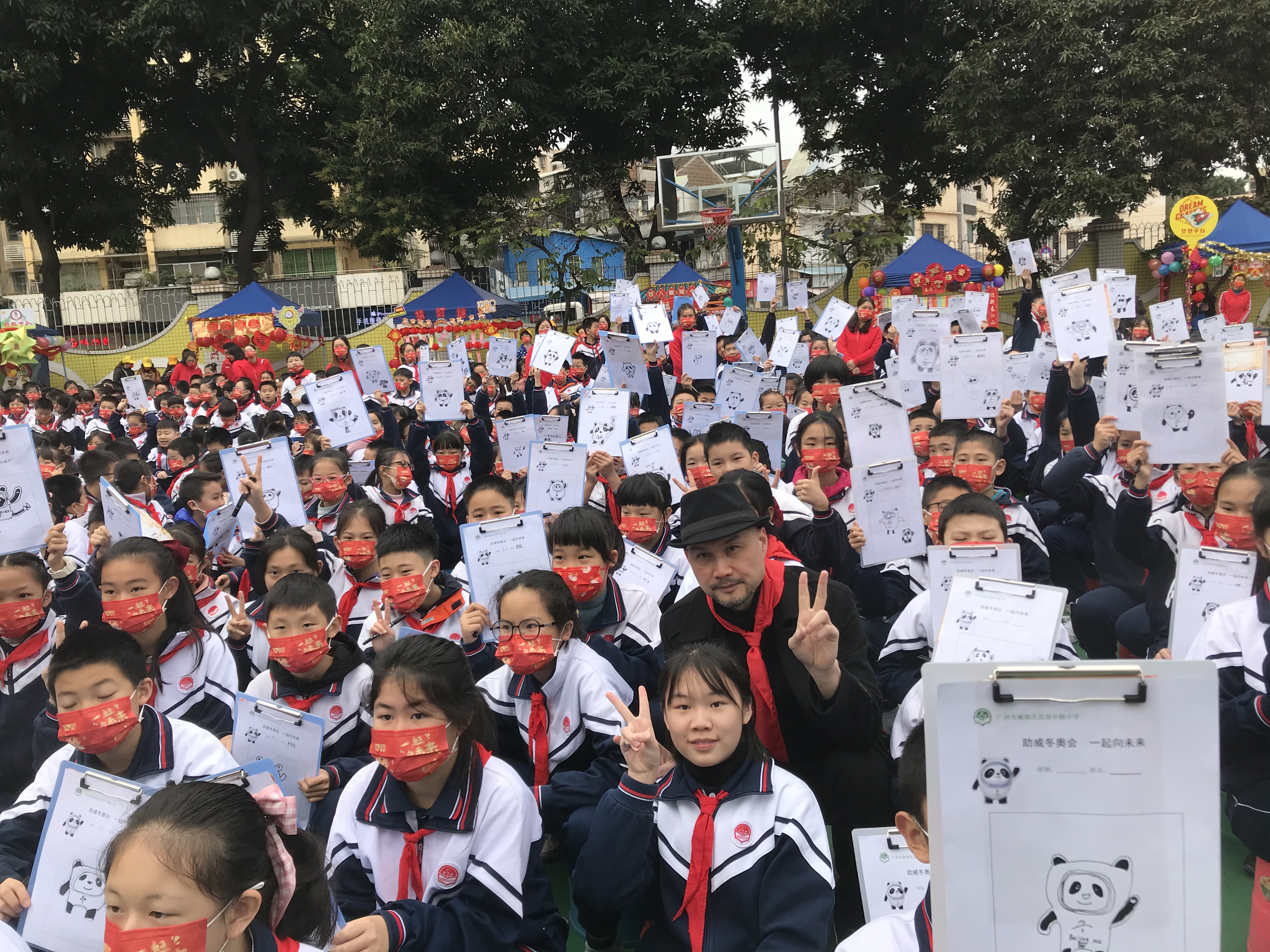 随后,昌岗中路小学学生在刘平云的带领下,举行千人画“冰墩墩”的活动,场面非常壮观。