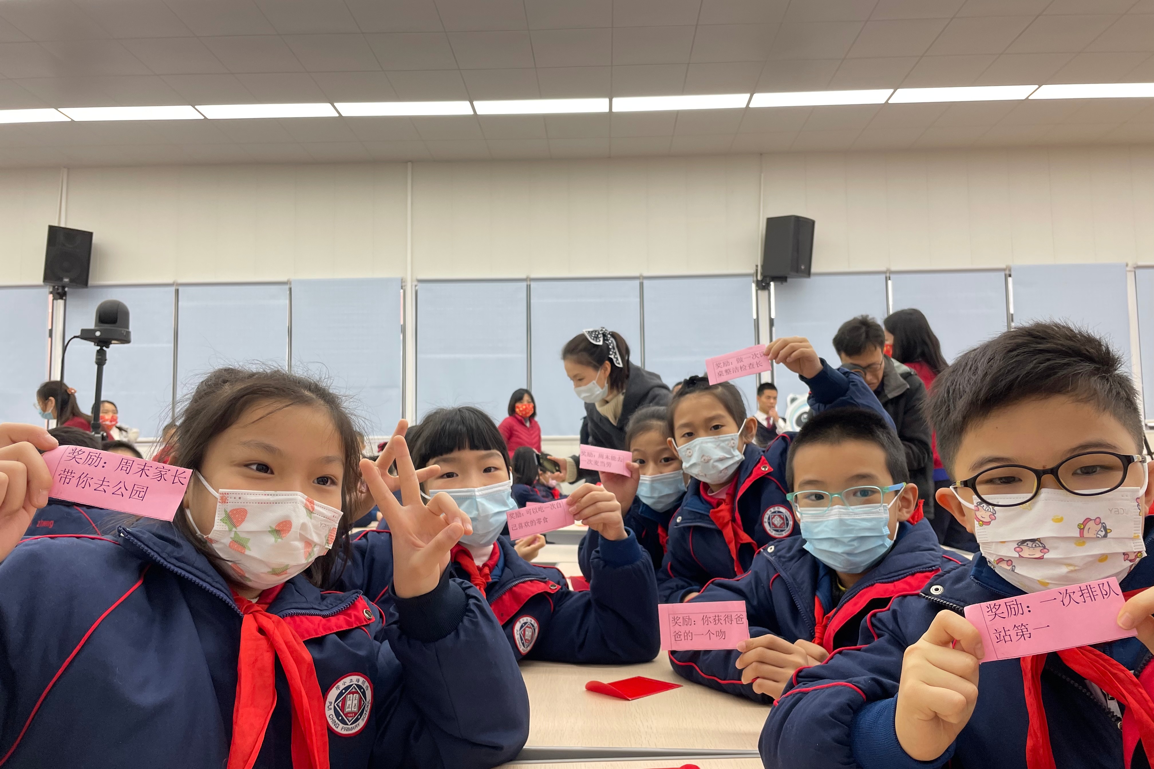 同学们还收到一份特殊的新年利是,里头大有乾坤,是一个戴着虎头的“太阳娃”。今年是华阳三十周年校庆,小朋友们对华阳的吉祥物“太阳娃”爱不释手。