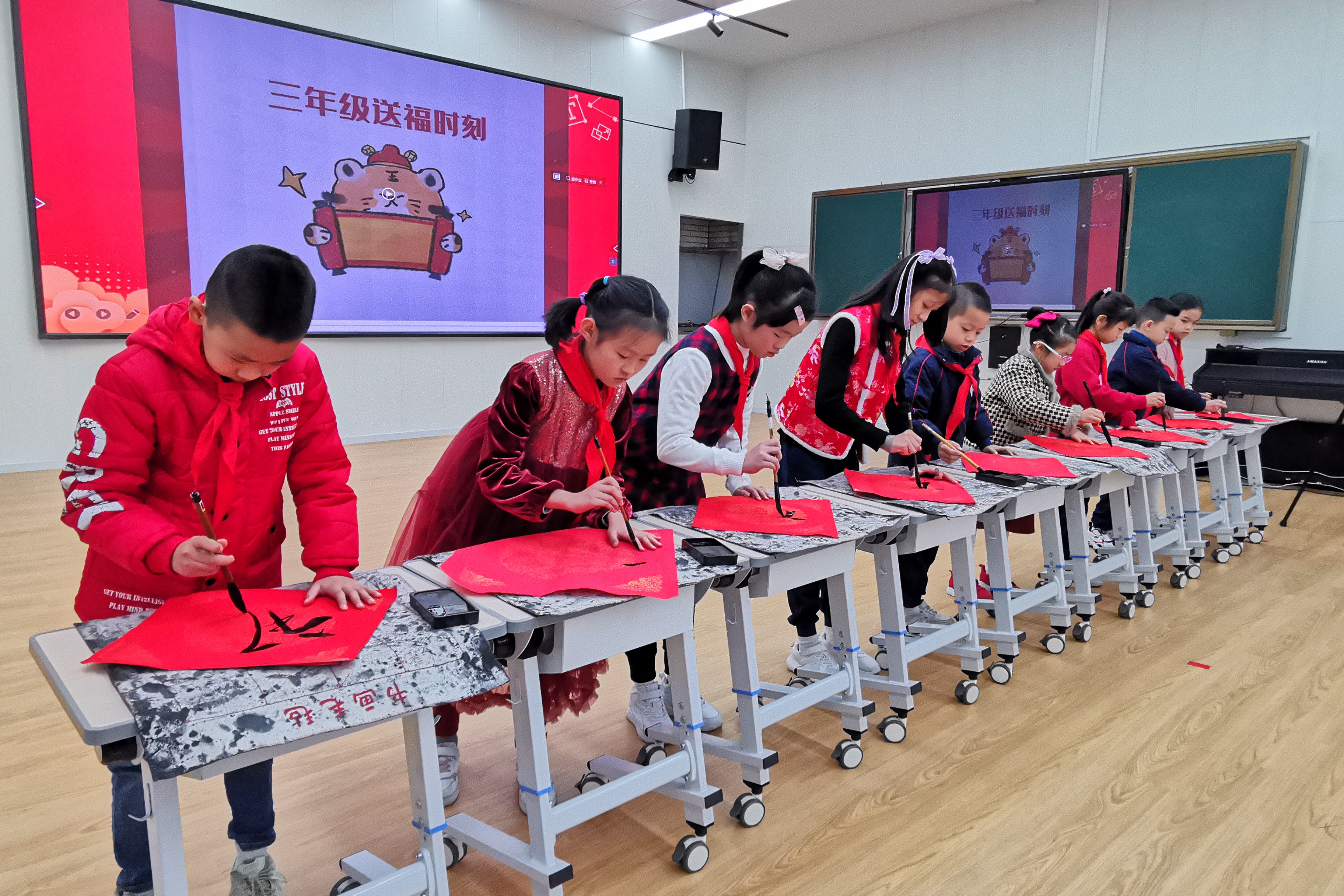 “六福盈门满西培”,西关培正小学三年级的小小书法家台上挥毫,送出“六福”祝愿。