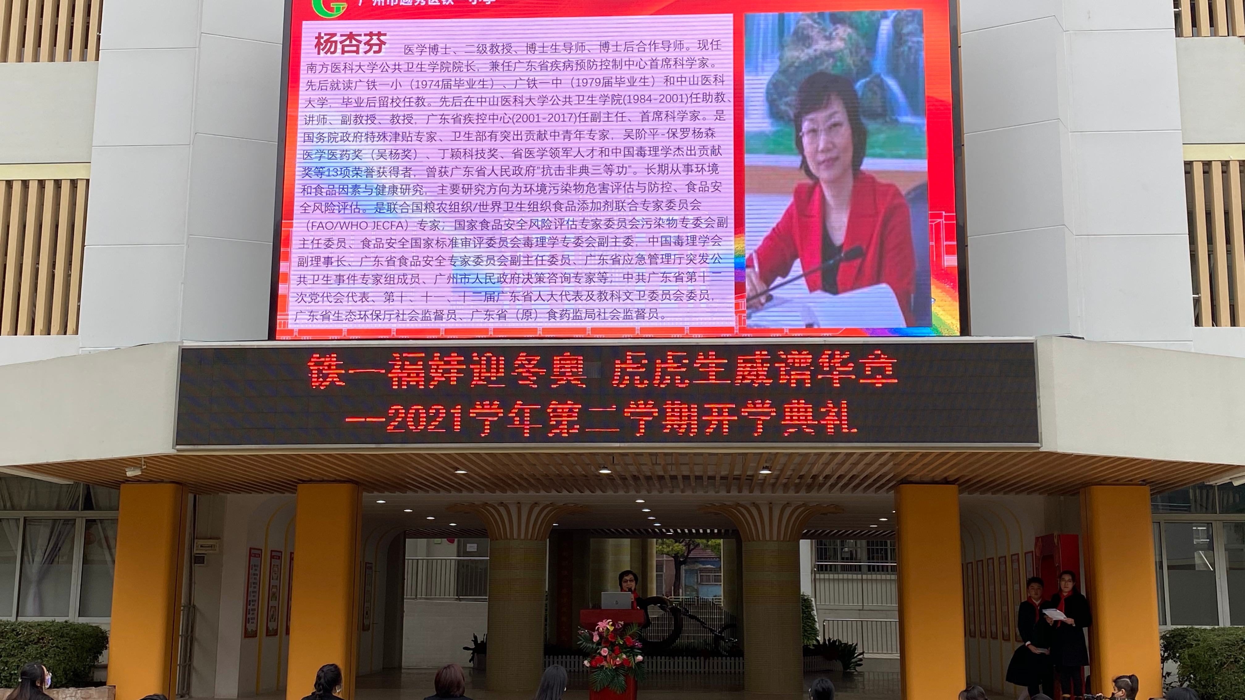 为让学生掌握更多健康知识,铁一小学在开学典礼上,邀请了杰出校友——铁一小学1974届毕业生、南方医科大学公共卫生学院院长杨杏芬,现场开展“校友大讲坛”。