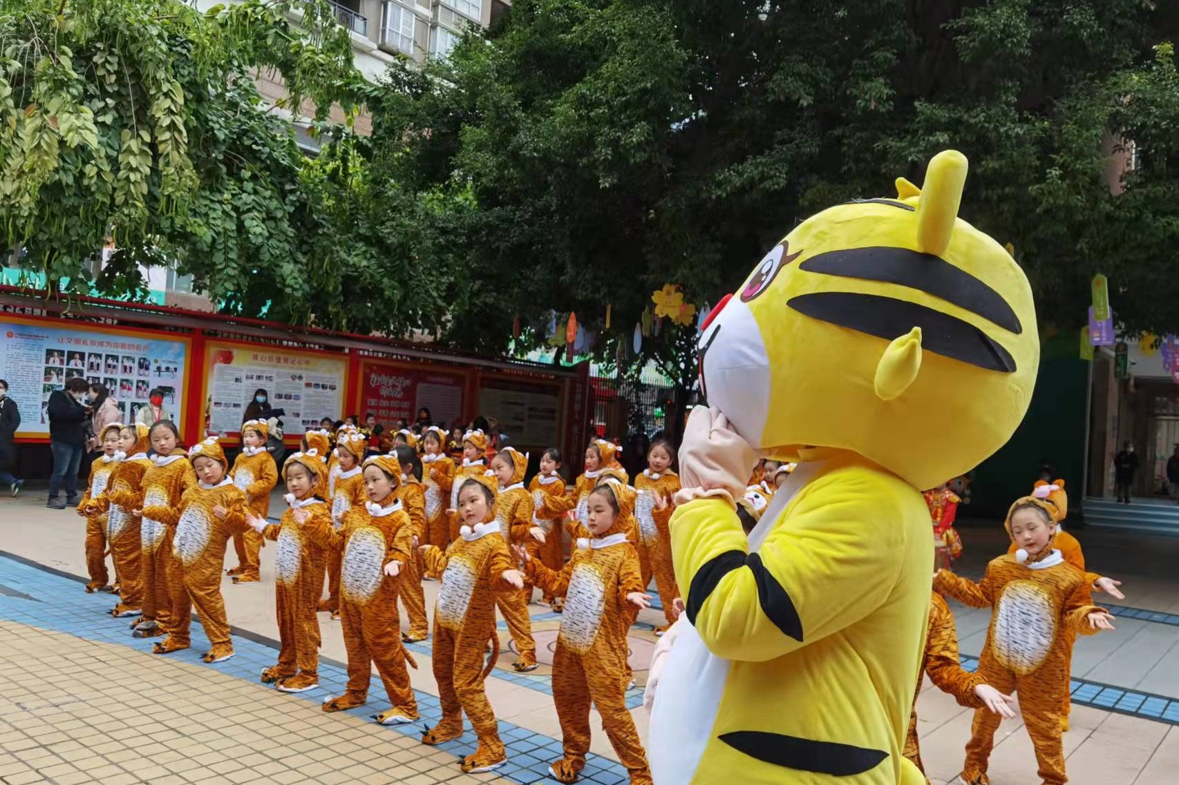 在天河区华阳小学,同学们戴上可爱的老虎头饰回到学校。“大老虎”和“小老虎”一起迎接同学们。