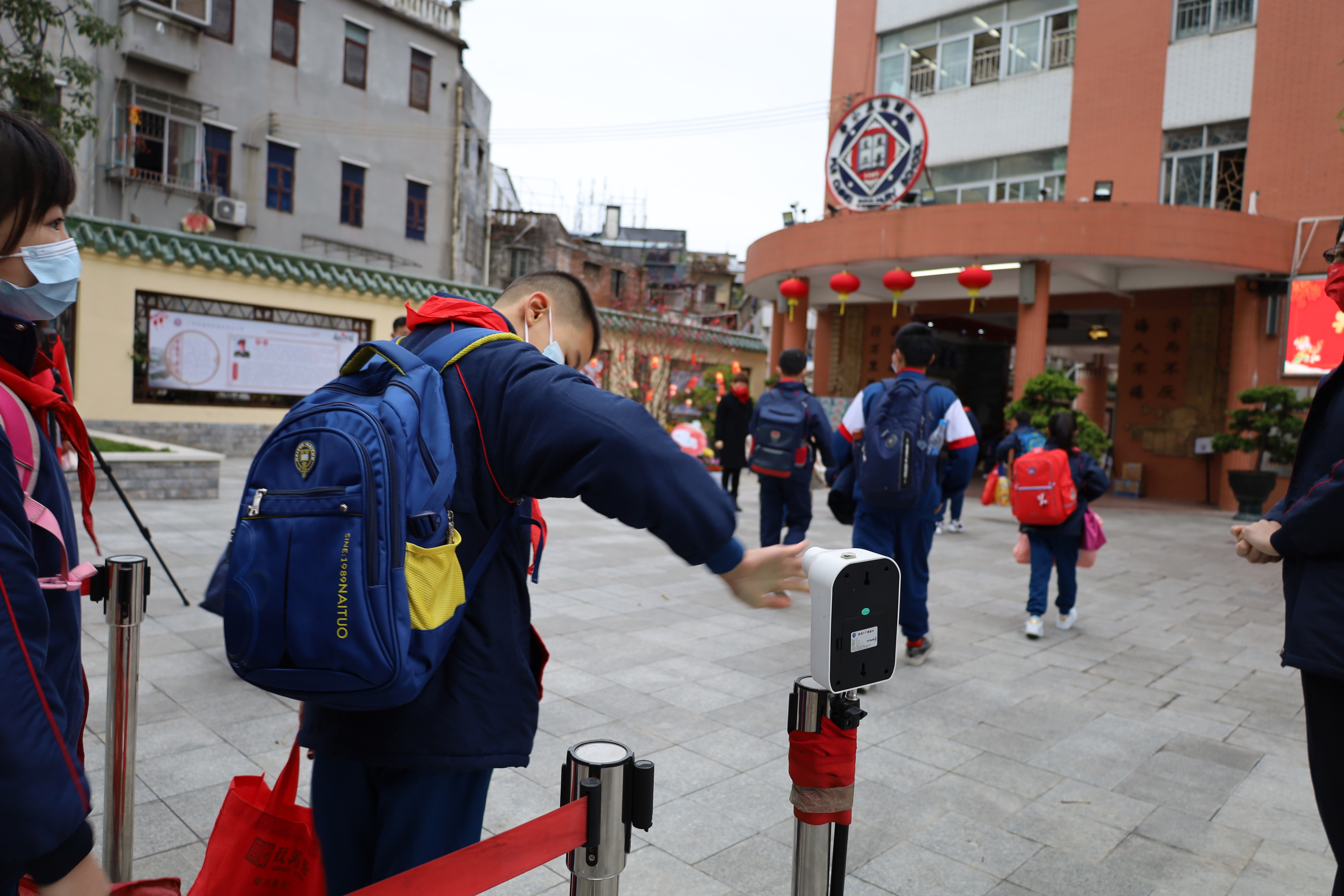 西关培正小学门口,学生正有序排队测温入校。