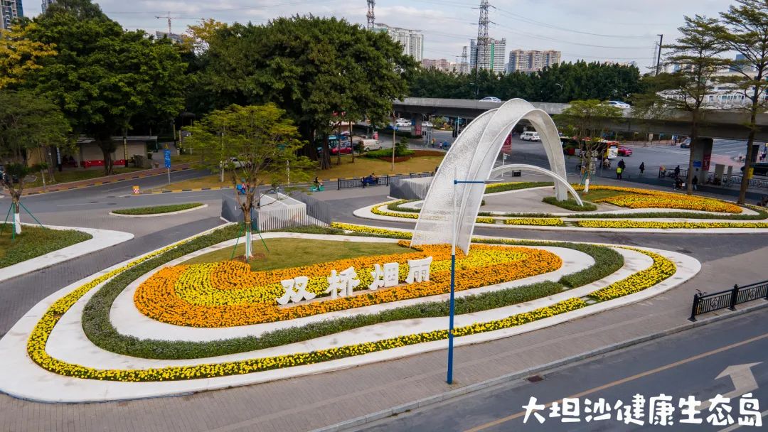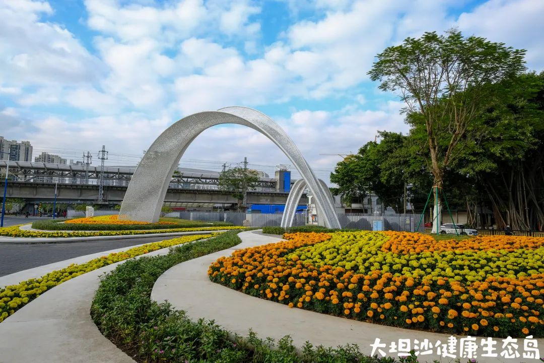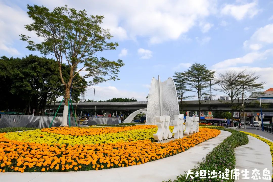 从入岛门户处放眼望去,洁白双桥与万寿菊的组合,是大坦沙岛送给入岛市民的第一件春天的“礼物”。
