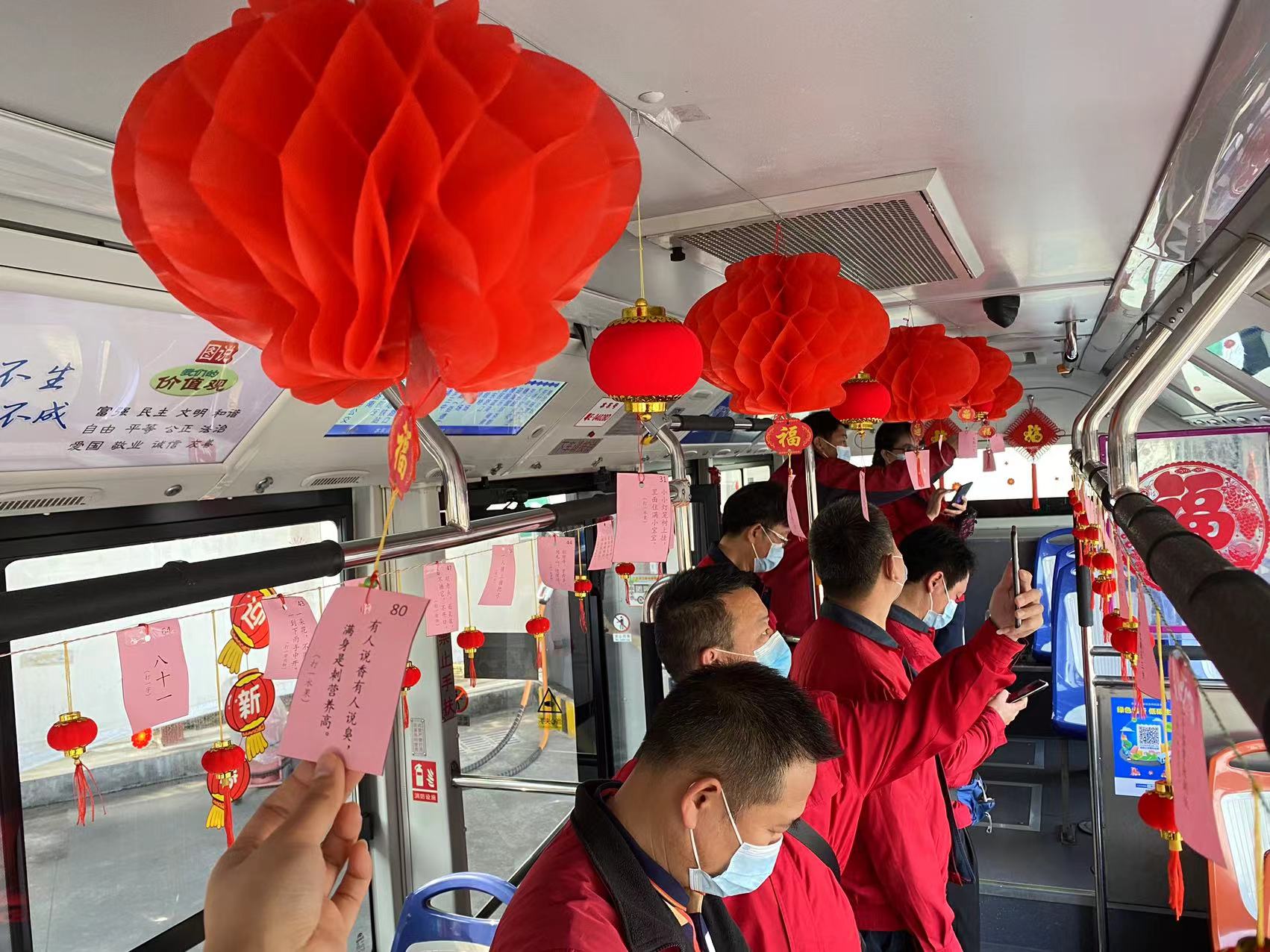 高高挂起的大红灯笼、中国结、美丽的窗花……踏入202旅游公交专线的车厢,浓浓的节日元素便映入眼帘。在灯笼下方,一张张字条上印着不同的谜语,灯谜的内容涉及成语、诗词、常用物、字谜等多方面。