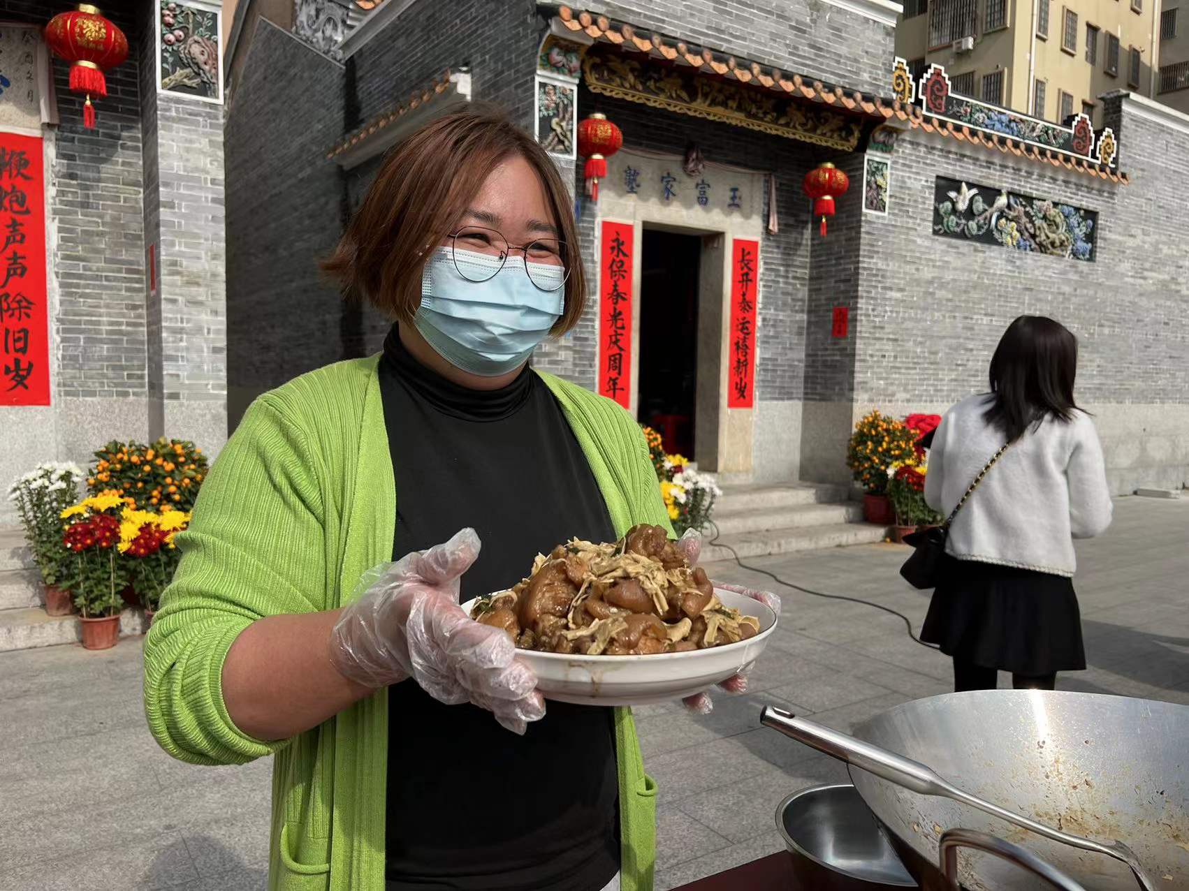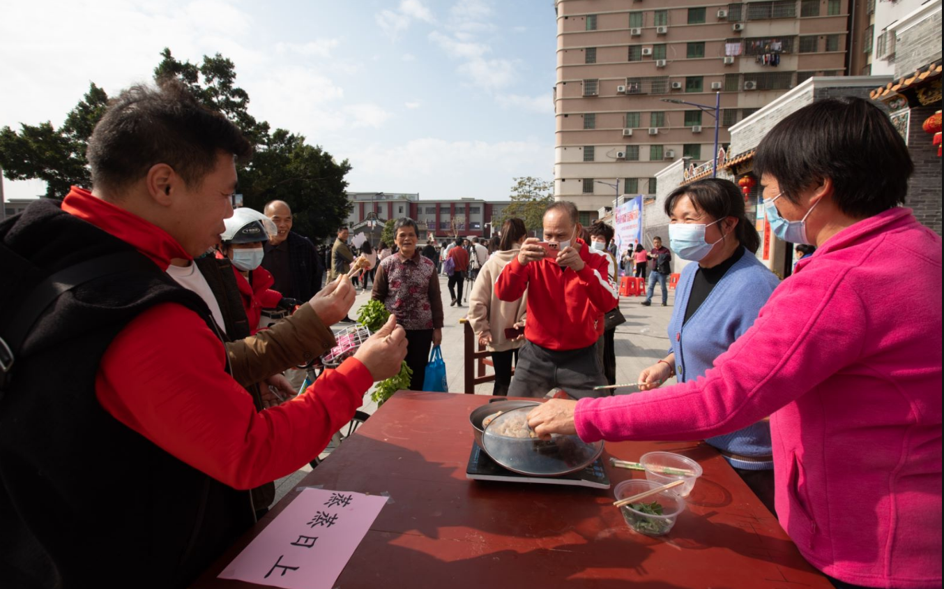 在科甲社区的私塾门外,巧妇们纷纷拿出自己的看家本领,现场烹饪经典粤菜,请参加活动的市民群众品尝。