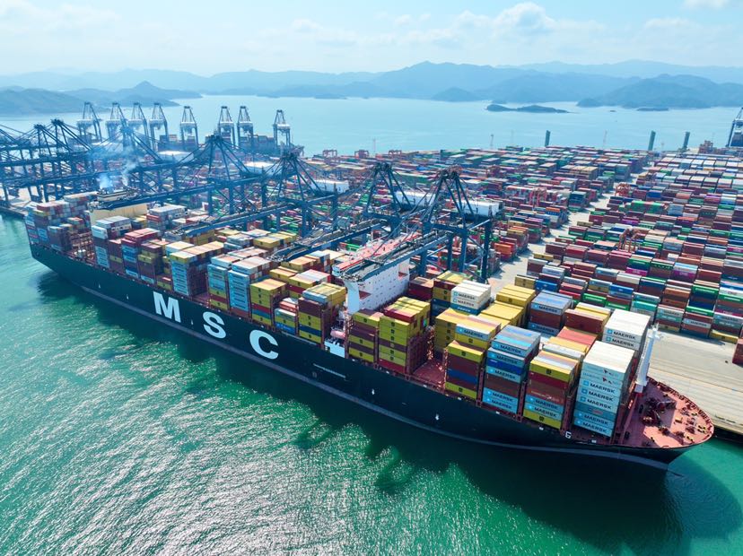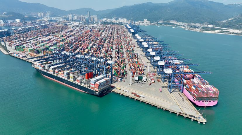 2月15日,深圳盐田港繁忙依旧,MSC MINA(地中海米娜)、ONE MINATO(第一海港 )等大型集装箱船在港口装卸货物。
