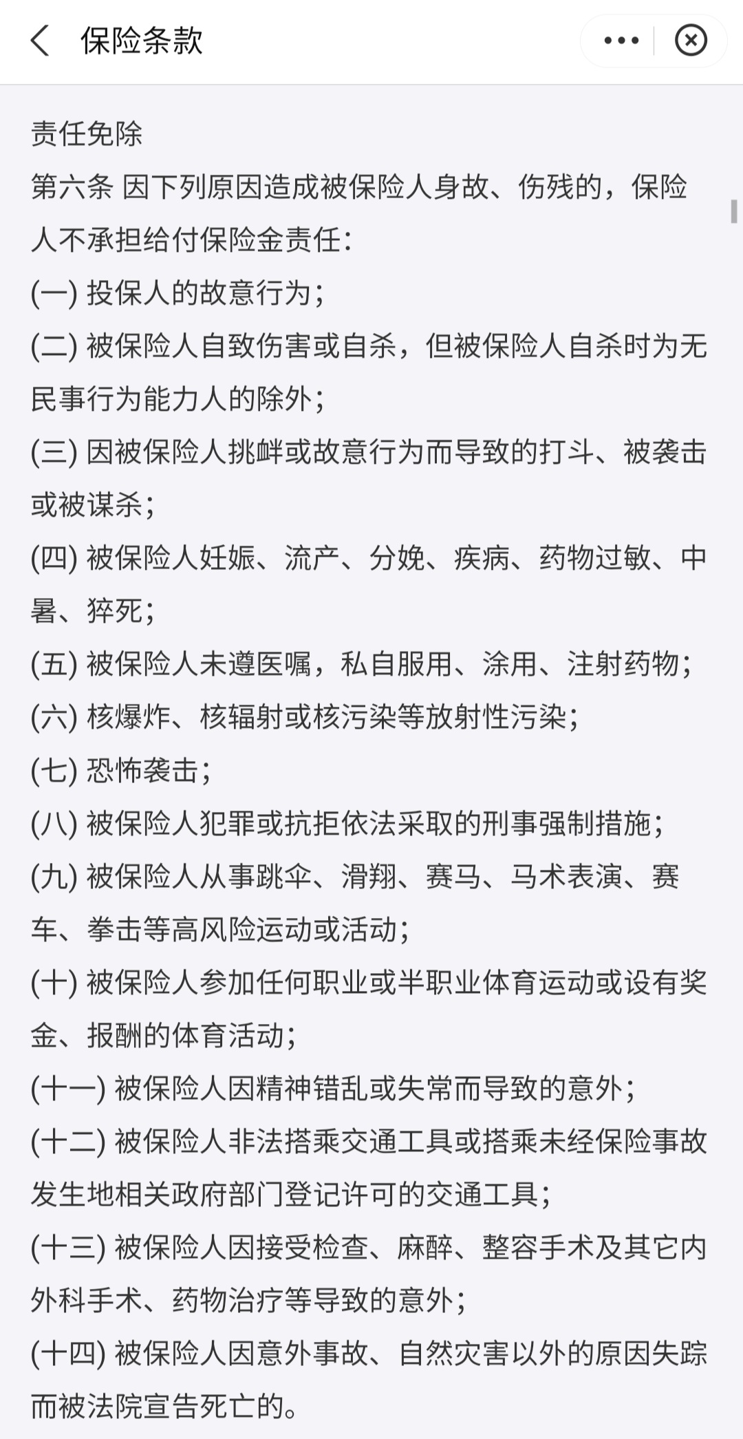 值得注意的是,目前多数普通意外险的条款,都将冰雪运动导致的意外进行责任免除。记者在某互联网平台看到,一款综合意外险的“责任免除”一栏中明确,因从事高风险运动或活动造成被保险人身故、伤残的,保险人不承担给付保险金责任。