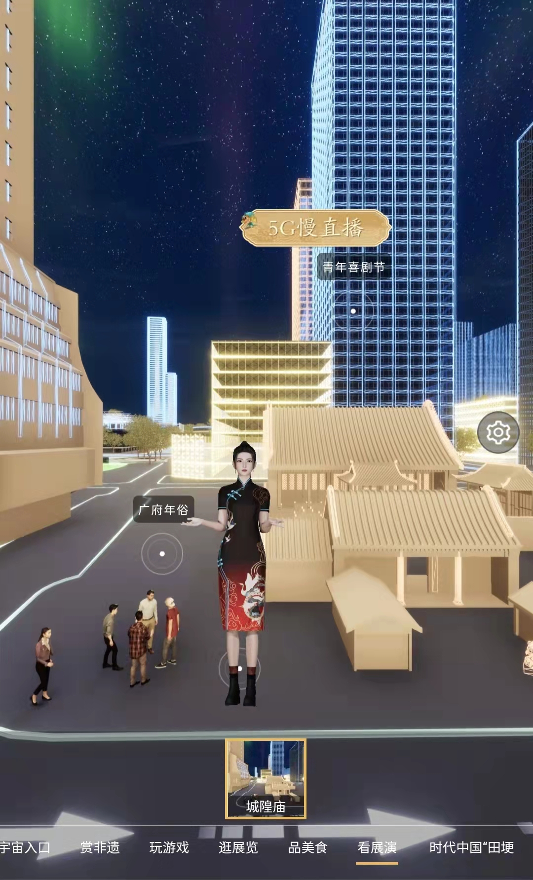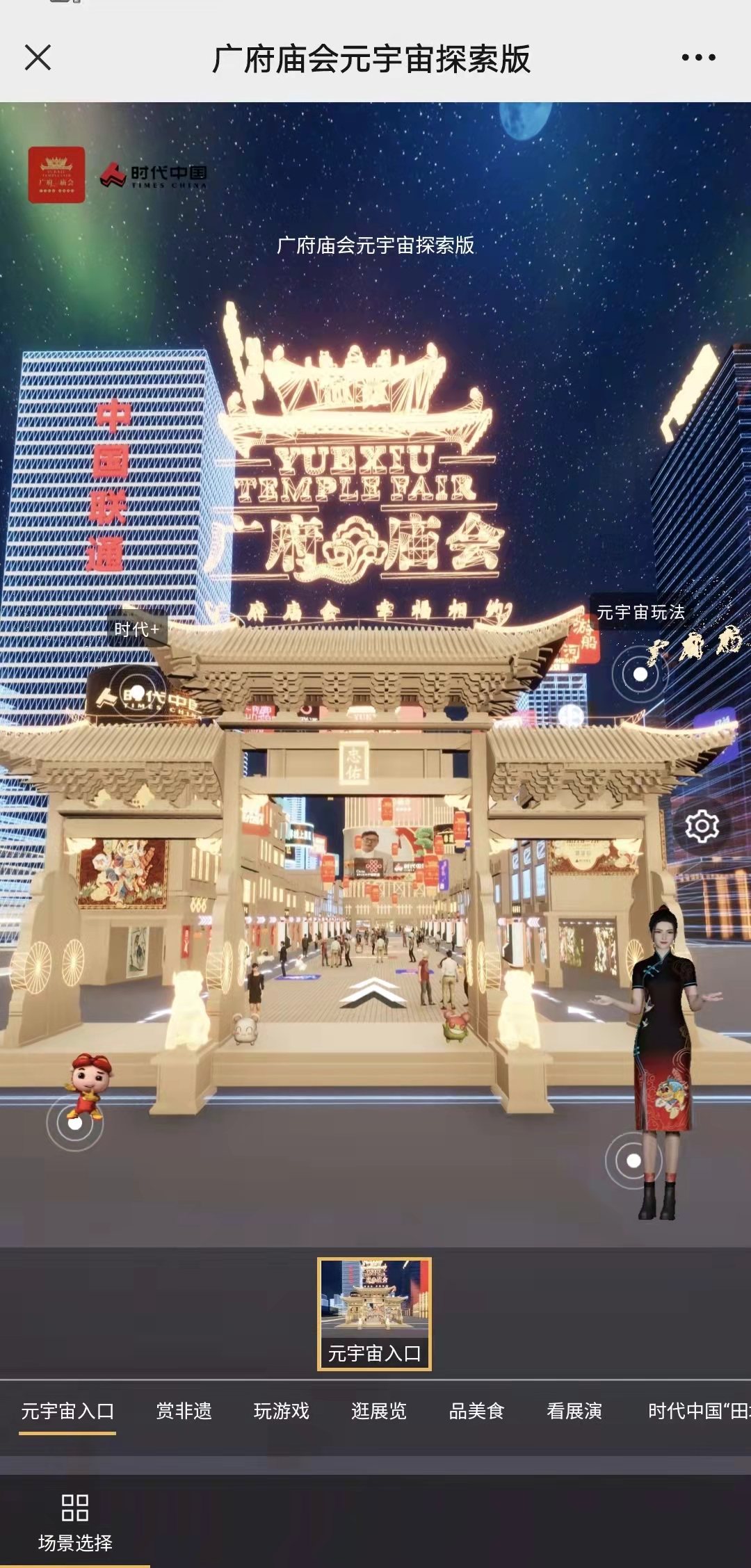 踏进元宇宙,首先映入眼帘的是街区右侧时代中国大楼,而独具特色的广府庙会元宇宙门楼上,游客可以点击左侧“时代+”闪烁图标,跳转至时代中国线上品牌馆。进入广府元宇宙街区后,游客可以赏非遗、玩游戏、品美食、逛展览、看展演。在游览不同的空间时,随时能触发各种彩蛋,听粤语讲古、粤剧名曲,了解广府民俗,看精彩的达人展演、军哥剧说,一键获取广府美食小百科,购买非遗文创、广府手信,玩转各种互动小游戏。2月16日至21日,市民还可前往广州北京路步行街中段,在“广府味·幸福年”线下快闪店,通过虚拟直播技术留下自己在广府庙会元宇宙中的影像。同时,广东省时代公益基金会 (以下简称“时代基金会”)也于本次广府庙会元宇宙亮相,并于北京路步行街设置时代中国“田埂花开”公益线下打卡点,呼吁大家关注乡村儿童艺术素质教育。