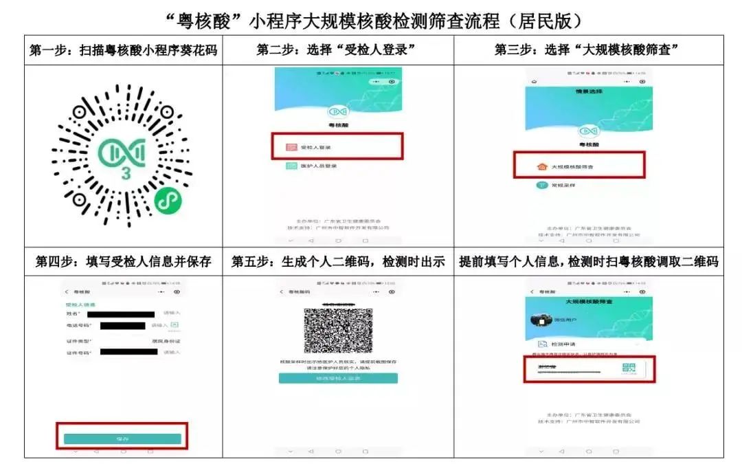 1.提前进入微信“粤核酸3”小程序,选择“受检人登录”→“大规模核酸筛查”→填写受检人信息并保存→生成个人二维码,检测时出示。