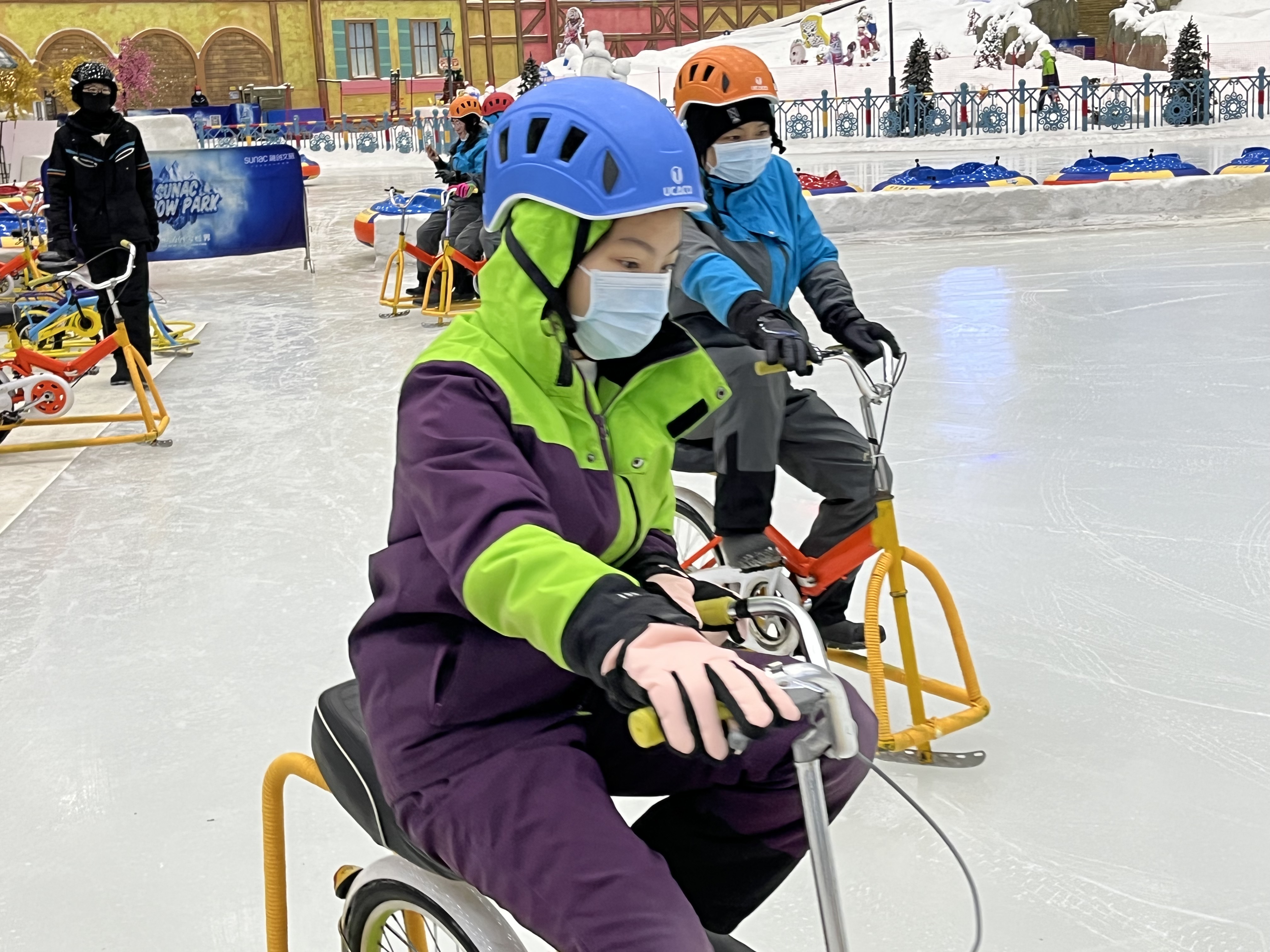 2月14日,虽然不是周末,但广州融创雪世界(以下简称”雪世界“)依旧一片热火朝天。来自全国各地的冰雪爱好者在这里滑雪。还有孩子们在冰上骑自行车。这里设有初学者滑道、初级滑道、中级滑道和高级滑道4条不同难度的雪道和单板练习区,雪道最高落差66米,其中包括世界首创的2条立体交叉雪道以及贯穿中级道和初级道的460米超长室内高山滑雪雪道。春节至今,伴随着冬奥会推动的冰雪运动热潮,融创雪世界的游客数量一直处于高位。来自湖南的王女士一家在这里玩了一天雪,但女儿还是觉得不过瘾,第二天,一家人又在这里玩了一天。目前,到这里进行雪上运动游客,广东省内占一半,另外一半则来自国内各个省份。