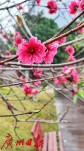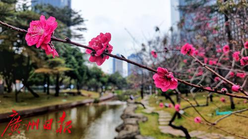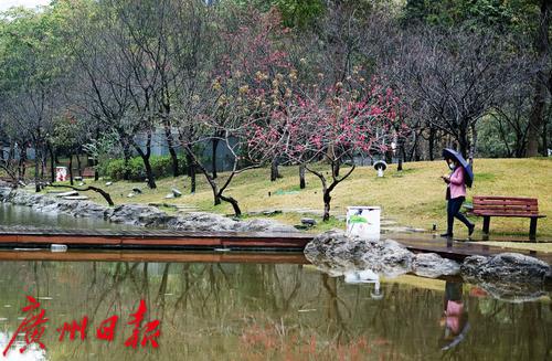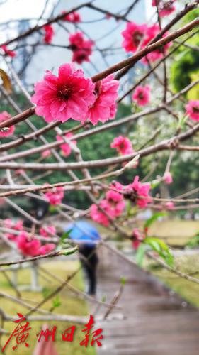 2022年2月17日,广州珠江新城花城广场,受冷空气影响广州市面降温降水,桃花岛桃花依然盛放。气象台预计,未来一周广东持续阴雨寒冷,2月18日白天强冷空气开始影响粤北,夜间影响广州。