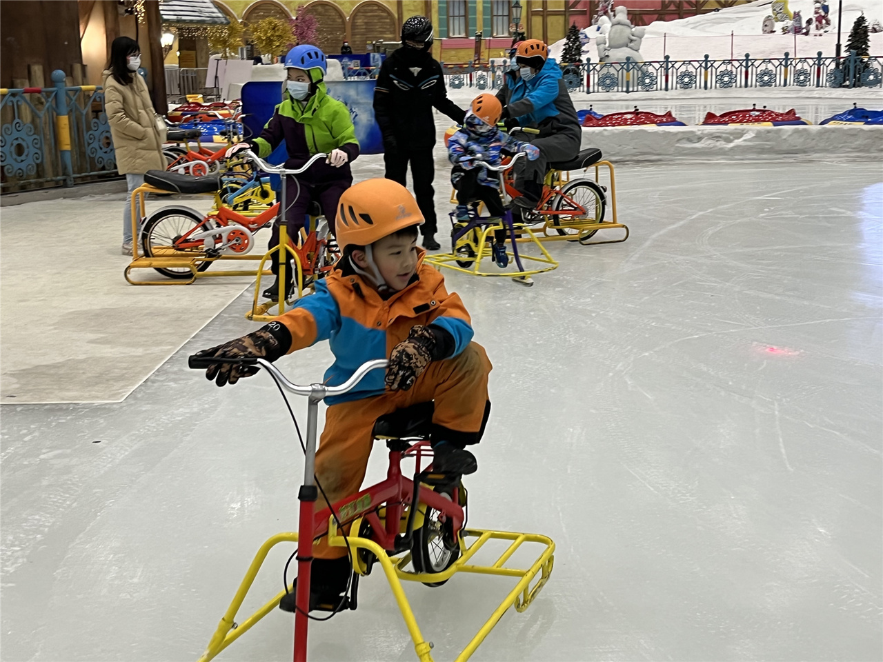 2月14日虽然不是周末,但广州融创雪世界(以下简称“雪世界”)依旧热闹,很多冰雪爱好者在这里滑雪,还有孩子们在冰上骑自行车。春节至今,这里的游客数量一直处于高位,几乎每天接待人数都在5000人以上。