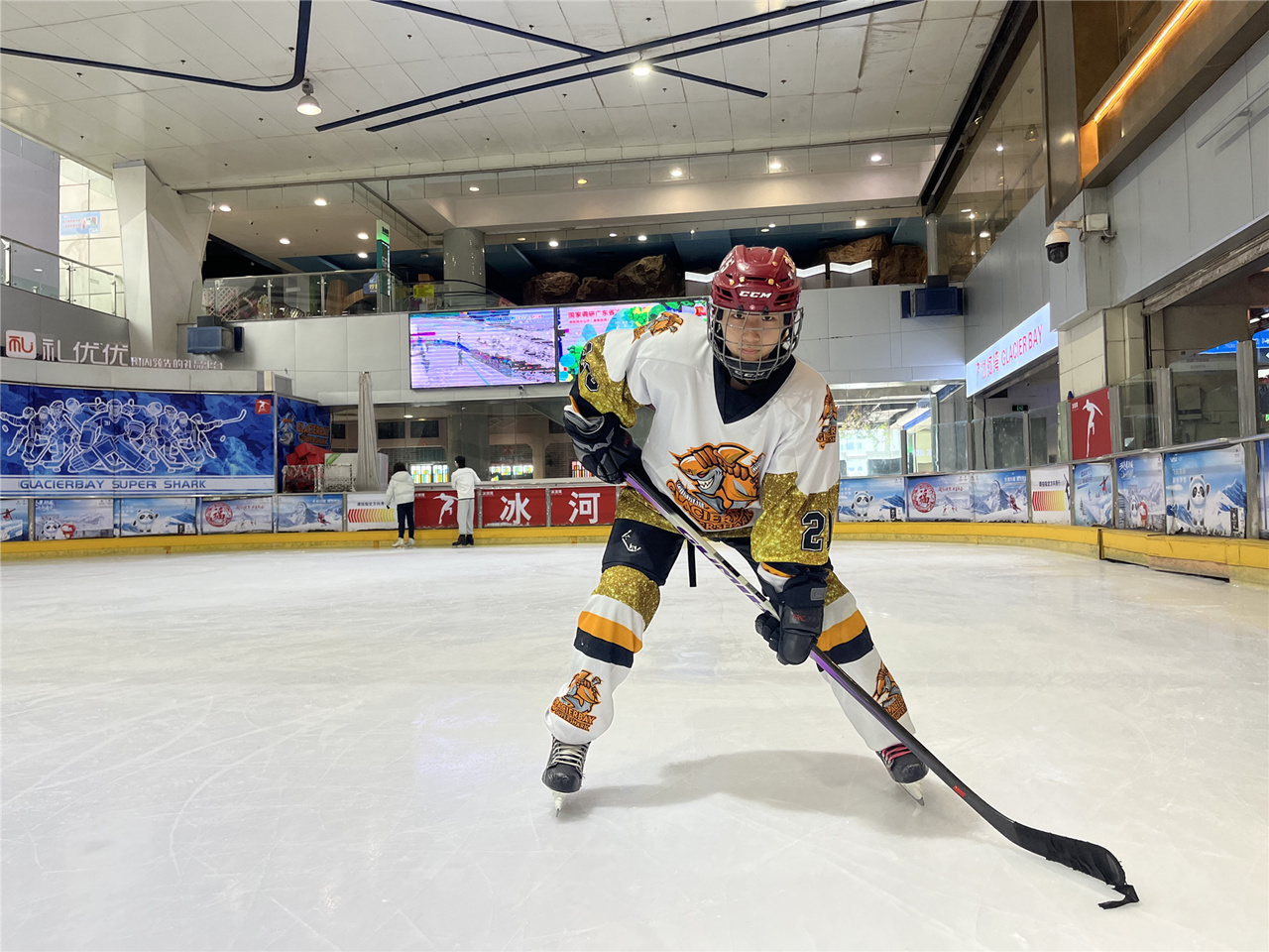 肖飞扬从3年前开始学习冰球,如今愈发觉得这项运动有趣,将冰球作为自己的体育特长。不过,练习冰球的过程十分艰辛,冰球运动既需要运动员具备扎实的技术基础,还需要团队配合,在高速运动中也容易受伤。像在训练中因为高速奔跑而撞上冰场的护栏或是直接摔倒在冰面上都是常有的事,哪怕穿着护具,她也经常摔得身上青一块紫一块。