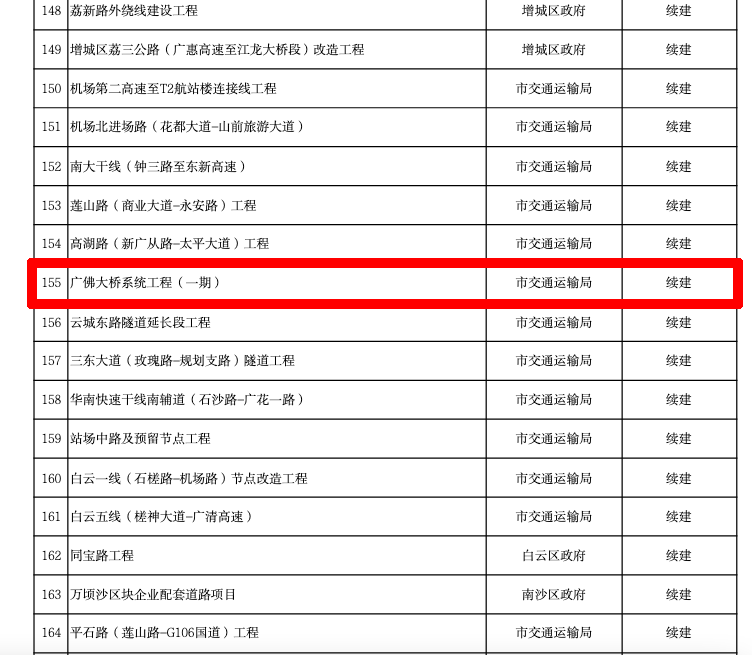 作为打通金沙洲和大坦沙岛通道的重要项目,广佛大桥系统工程一期项目是广佛同城化的重要举措。该项目中,连接佛山南海和大坦沙岛的跨江特大桥——白沙河大桥,已于2020年12月25日开工。此外,广佛大桥系统工程一期项目白云区段已于2021年3月移交全部施工用地,项目主桥桥墩桩基预计今年年底基本完成。
