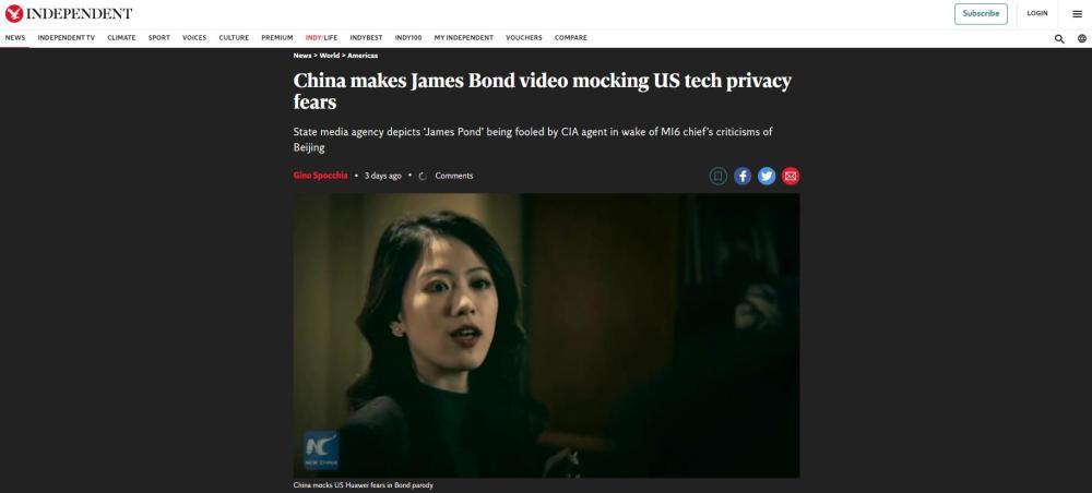 网友们还顺利接住了微电影密集抛出的一个个国际政治“包袱”——“棱镜门”、阿桑奇案、华为案、“债务陷阱”、英美千疮百孔的跨大西洋特殊关系……网友们看出了电影开头“英国特工即将赴美公干”和片尾“美国间谍被派监视英国”这二者间的呼应关系,看出了英国特工抱怨经费捉襟见肘和后面调侃摩尔反华私心之间的承接关系,看出了特工0.06拿错剧本,把美国的丑事扣在中国头上,是在致敬美国脱口秀演员Lee Camp。
