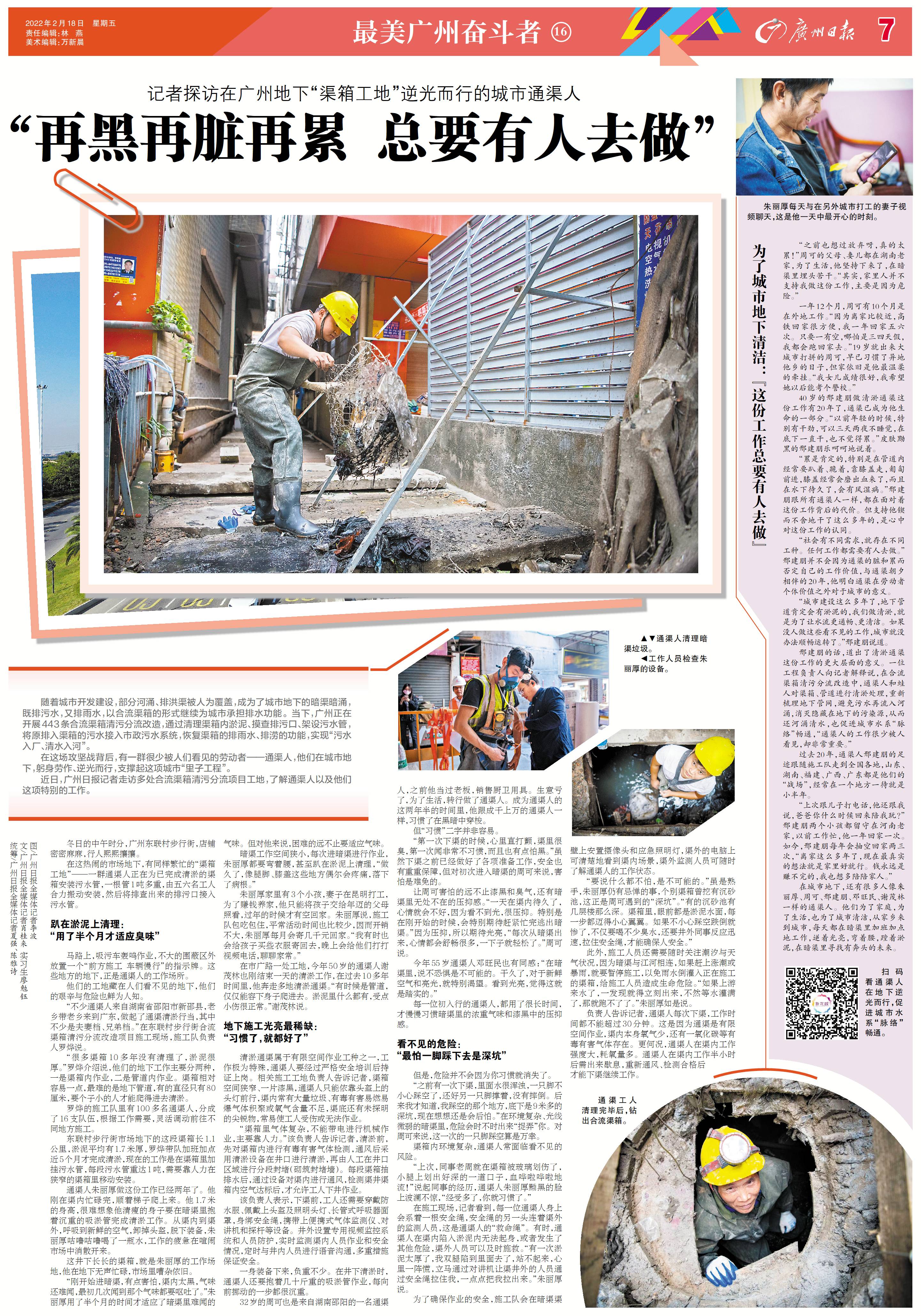 邢建朋的话,道出了清淤通渠这份工作的更大层面的意义。一位工程负责人向记者解释说,在合流渠箱清污分流改造中,通渠人和蛙人对渠箱、管道进行清淤处理,重新梳理地下管网,避免污水再流入河涌,消灭隐藏在地下的污染源,从而还河涌清水,也促进城市水系“脉络”畅通,“通渠人的工作很少被人看见,却非常重要。”