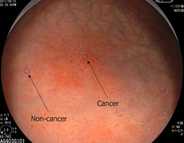 上图正中央稍稍红肿的粘膜,就是早期胃癌,这是胃癌刚刚长出来不久,还没发展成气候的样子,注意,这是放大后的图像,真正的病变,比指甲还要小!!