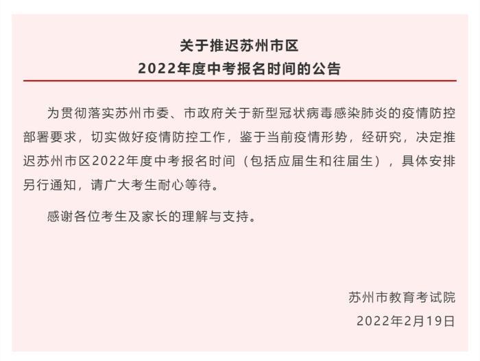 据苏州市教育考试院网站消息,19日,苏州市教育考试院发布公告称,鉴于当前疫情形势,经研究,决定推迟苏州市区2022年度中考报名时间(包括应届生和往届生)。
