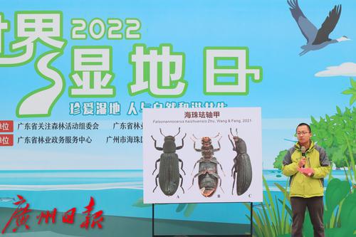 本次活动最大的亮点莫过于昆虫新物种——“海珠珐轴甲”的亮相。2021年底,海珠湿地自然学校自然导师朱江在国际学术期刊Biodiversity Data Jounral上发表一新物种,系该物种在世界上的首次发现,将其命名为“海珠珐轴甲”(Falsonnanocerus haizhuensis)。新物种标本整体黑色,体长6.2毫米,外形为纤细的长卵形,背面有中等程度的隆起,腹面微隆,体覆短的黄色毛。该物种隶属于珐轴甲属,该属此前已在日本、泰国、斯里兰卡等地被各国昆虫学者采集并记录到,此次是中国的首次正式记录。珐轴甲属体色常较深,为拟步甲科,窄甲亚科,轴甲族的小型昆虫。体长往往低于1cm,习性成谜,极少被人类采集或观察到。该属包含13个已知物种,加上新种海珠珐轴甲共达14种。这是继海珠湿地核心保育区内发现海珠斯萤叶甲之后,又一昆虫新物种被发现。