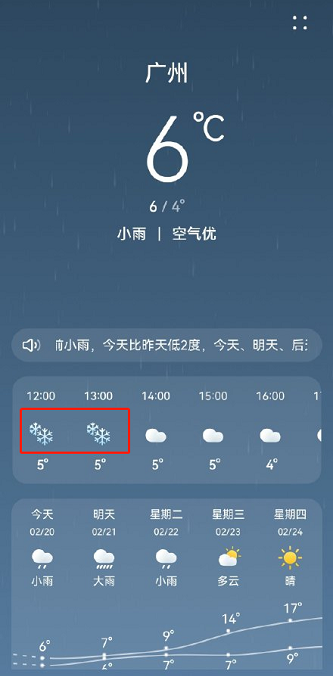 自从2016年下过雪,每次降温都有很多网友关心在广州能不能再次见到雪花。最近这次降温降幅大,又伴随连绵不断的降雨,网友们盼雪的热情更浓。更让网友感到兴奋的是,一些手机软件上给出的预报也出现了雪花图标,以至于昨天夜间就有网友想要到白云山摩星岭等候雪花降临。