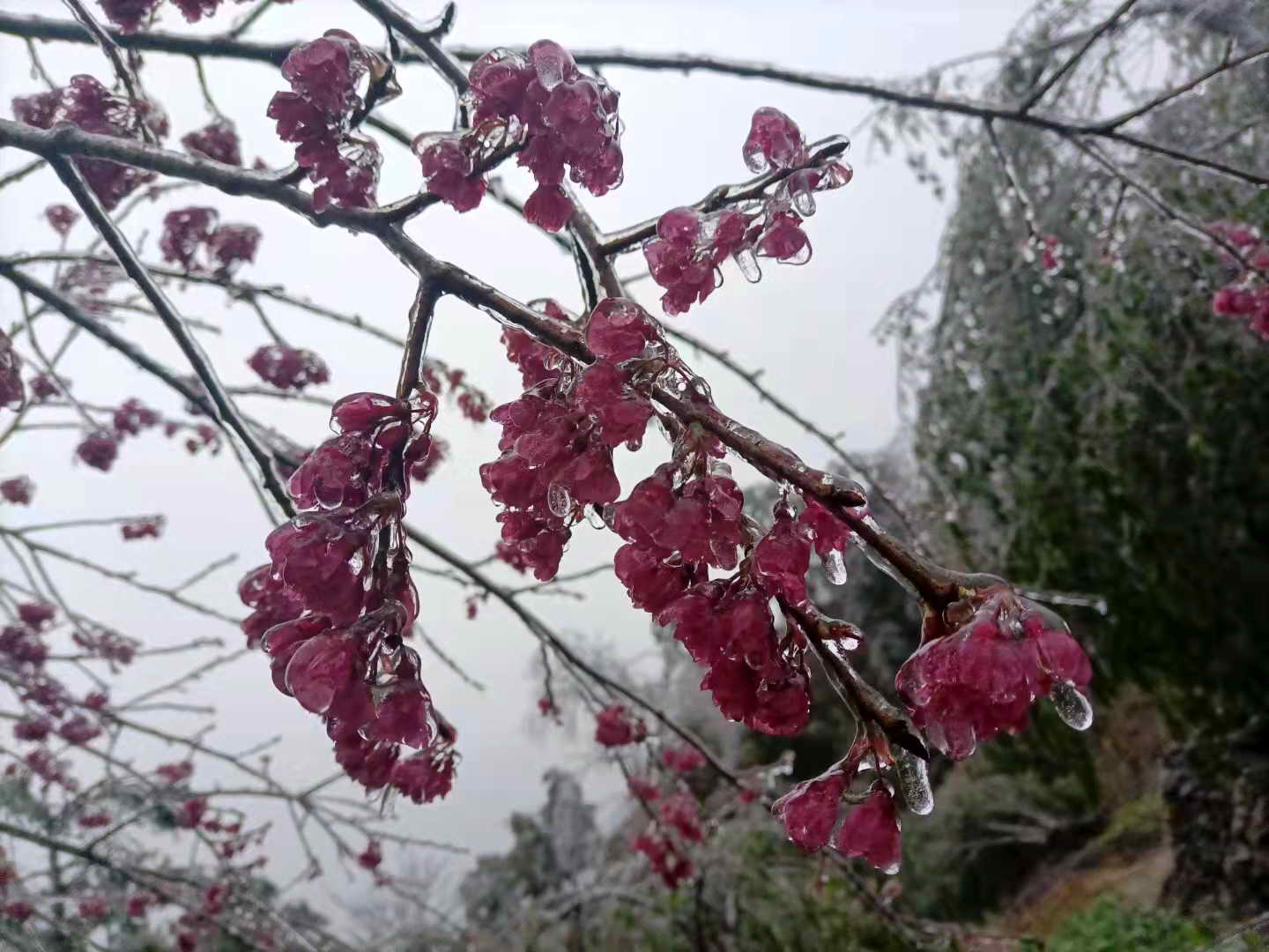 在新丰县黄磜镇的岭南红叶世界,盛放的粉红色樱花披上了晶莹的“水晶装”,红装素裹,分外妖娆。而在沙田镇金青村风力发电场,强劲的寒流使得水气在这里凝成漫山遍野的雾淞和冰挂,一片雪白,伴以流动的云海,宛若仙境。