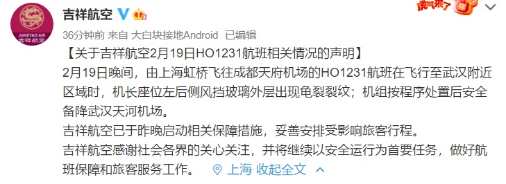 此前有媒体报道,2月19日,原计划从上海虹桥飞往成都天府机场的吉祥航空HO1231航班,因驾驶舱玻璃出现蛛网裂纹,临时改变飞行计划,于当天21点23分备降武汉天河机场。