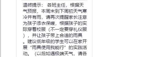 乐贤坊小学的班主任也提示家长,要根据孩子的实际需要穿着校服,不一定要穿礼仪服。
