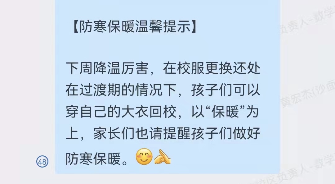 荔湾区沙面小学昨天已提醒家长,今日孩子们可以穿自己的大衣返回学校,“保暖为上”。