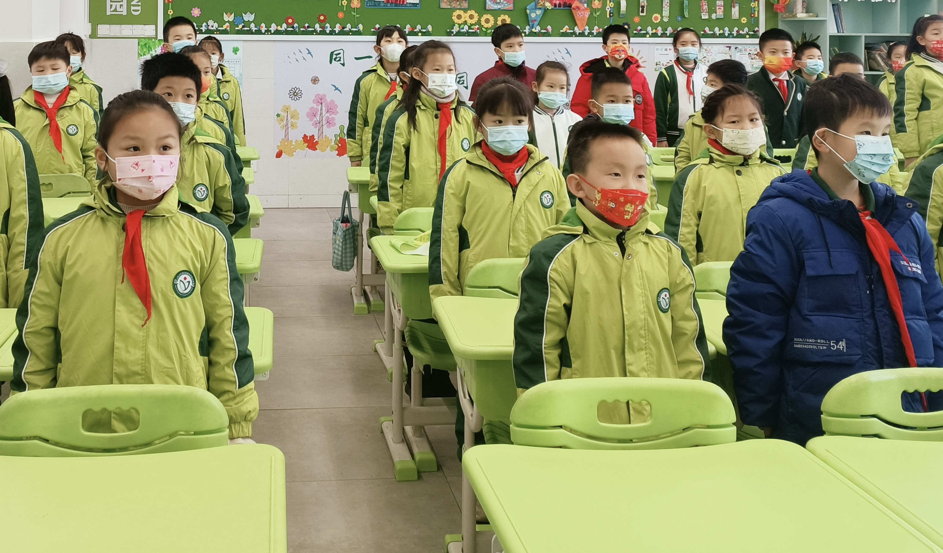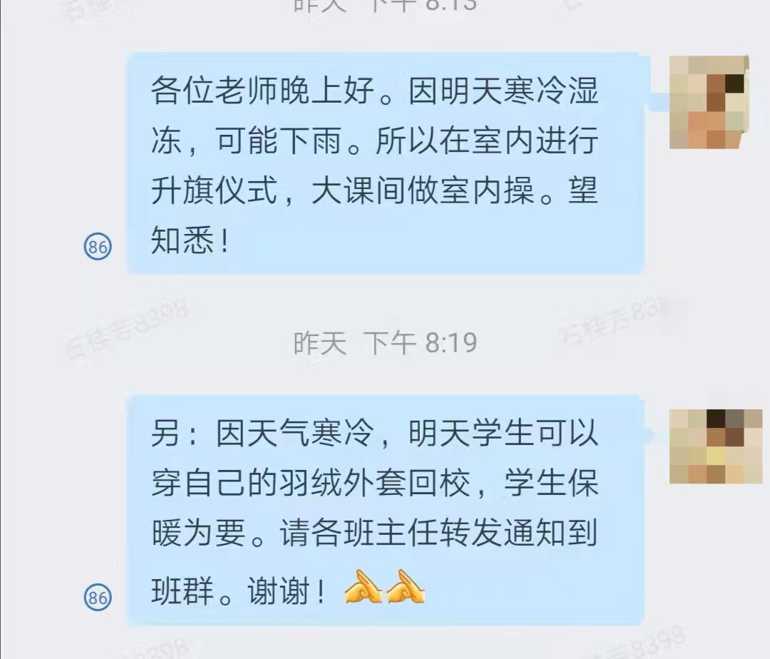 西关培正小学在昨天就让班主任老师们通知家长,今天升旗仪式改在室内进行,大课间也改为做室内操,学生“保暖为要”,可穿自己的羽绒外套回校。