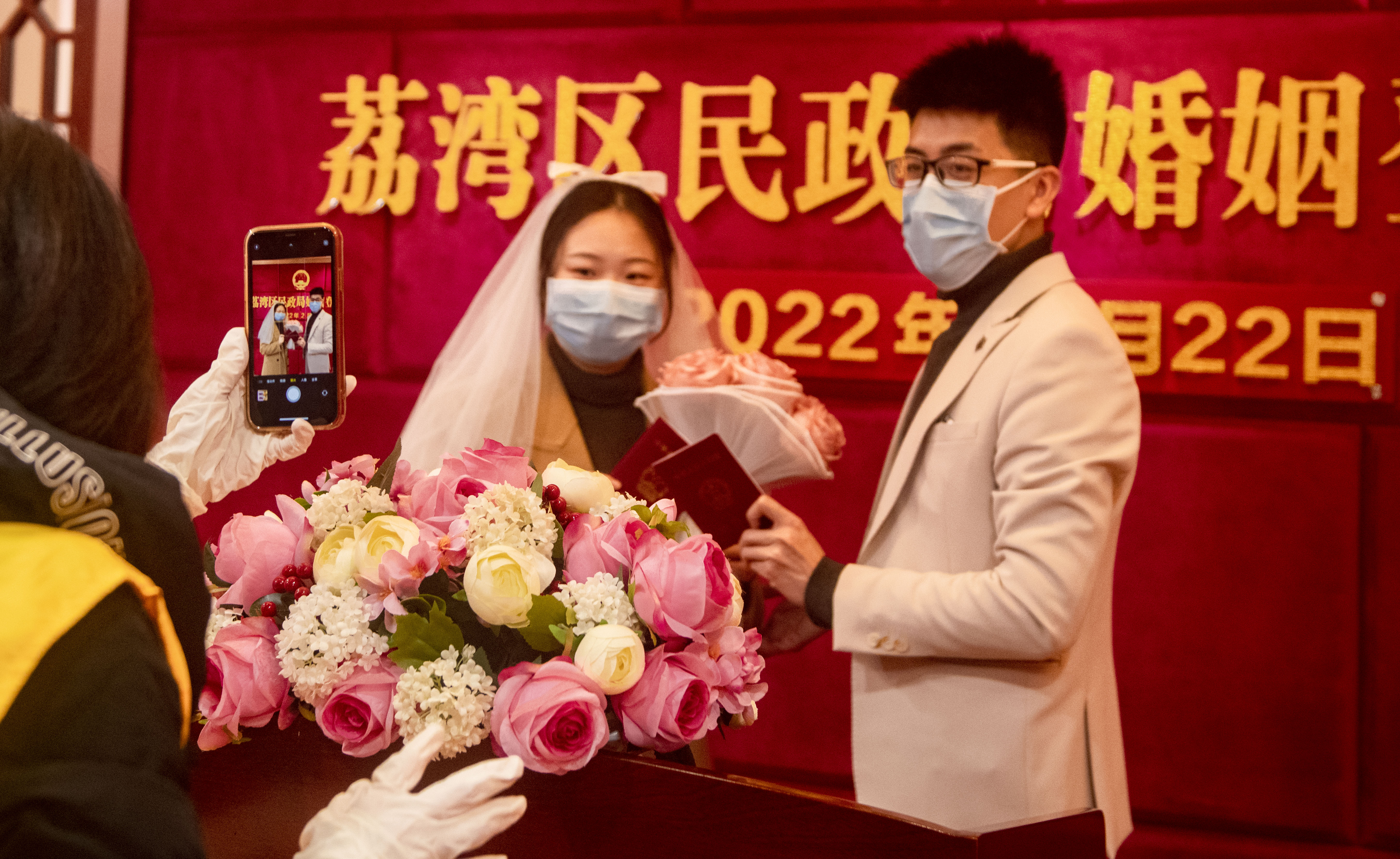 2022年2月22日,星期二,也是壬寅虎年正月廿二。2的谐音为“爱”,被称为2022最有爱的一天。这一天,荔湾区民政局婚姻登记处预约登记量爆棚,全体婚姻登记工作人员提前上岗,截至发稿时,已有100多对新人领取结婚证。