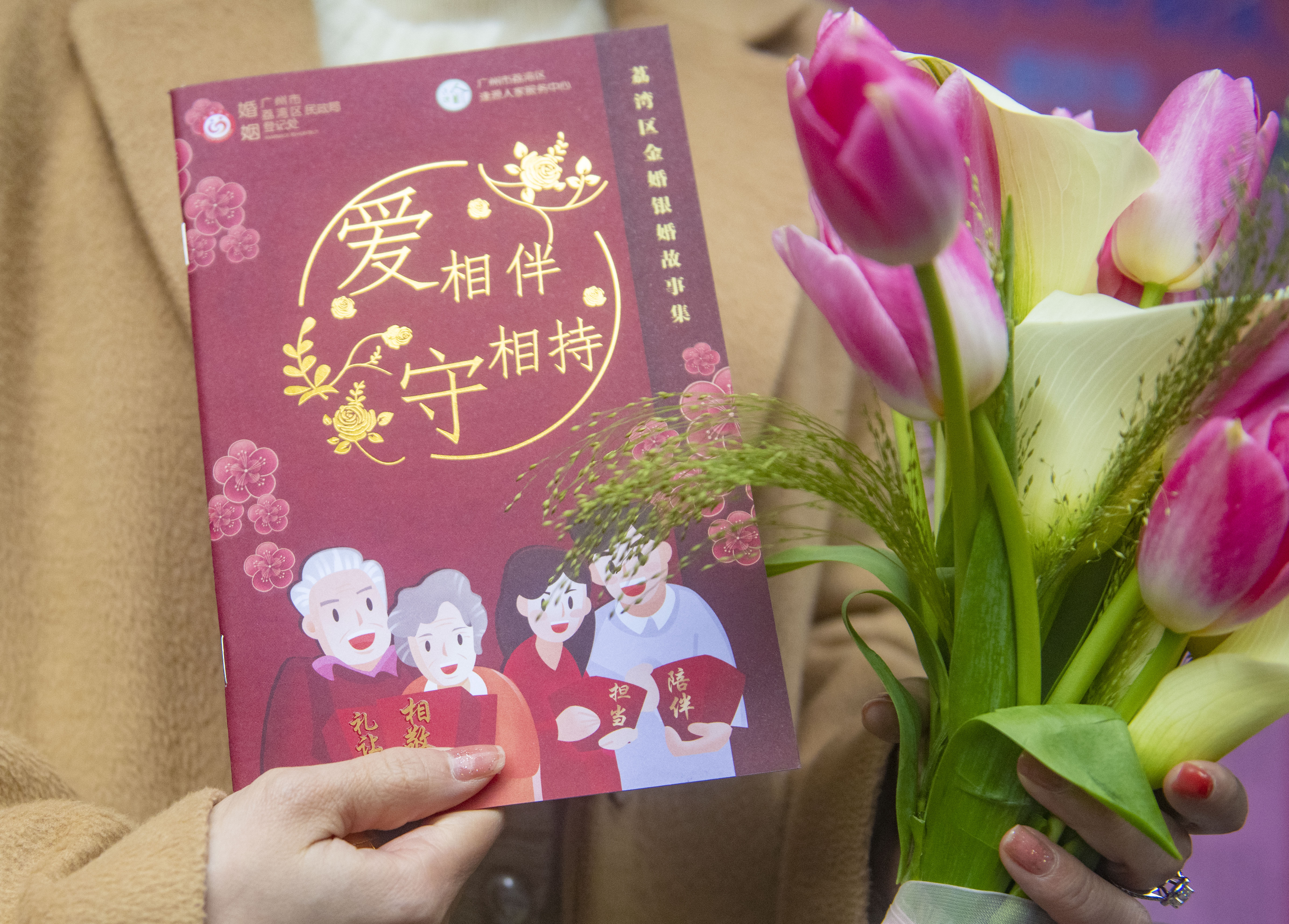 同时开展红色基因传承、倡导好家风活动,荔湾区婚姻登记处与逢源人家服务中心合作,先后采访了包括军休干部在内的16对金婚银婚夫妻,记录了他们的宝贵婚姻心得,编制了《“爱相伴 守相持”荔湾区金婚银婚故事集》,现场婚姻登记员为新人们赠送小册子,希望新人学习金婚银婚夫妇幸福婚姻相处之道,让爱延续下去。