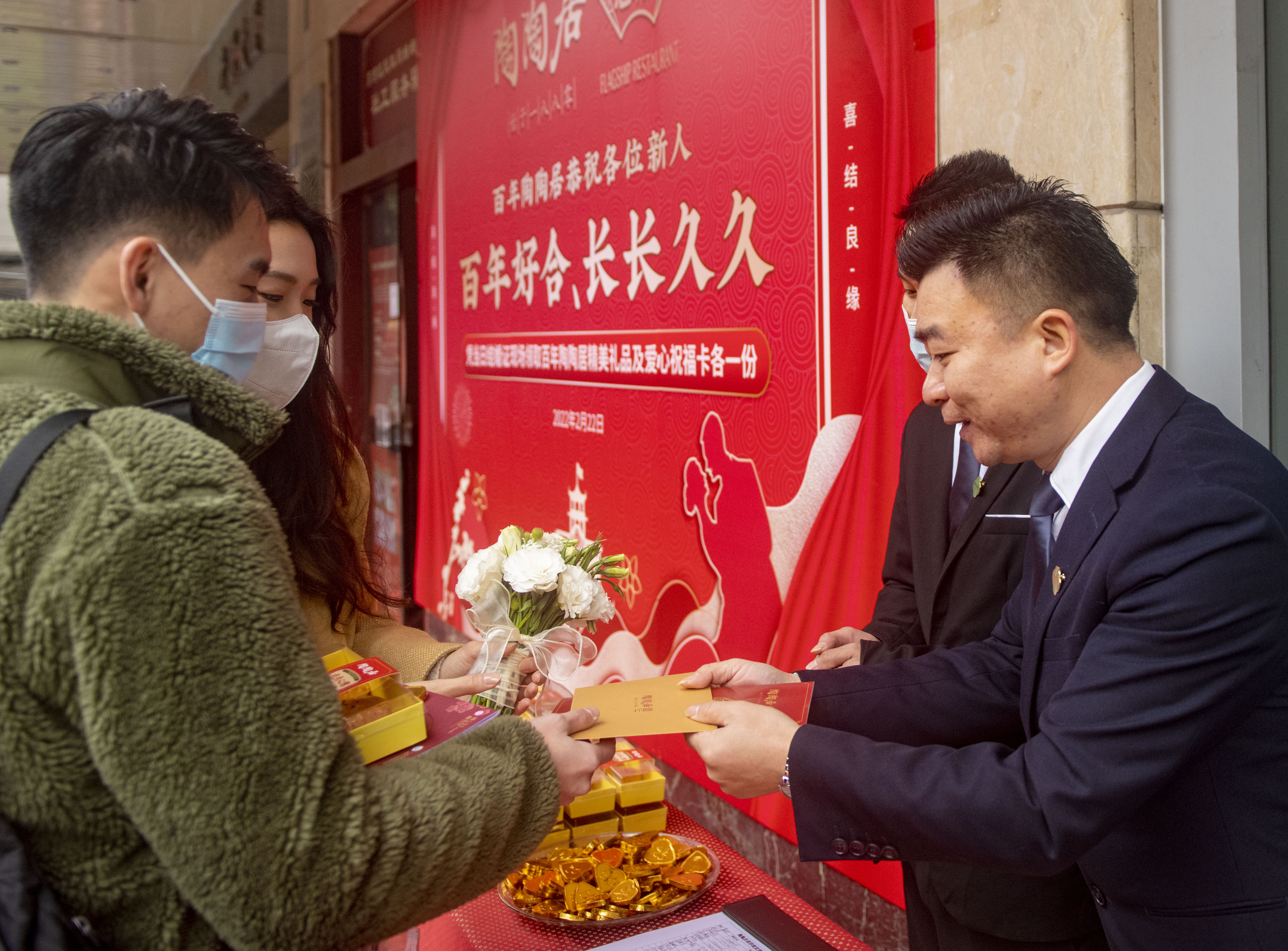 甜蜜时刻,怎么少得了甜蜜的点心?登记大厅外,婚姻登记处邀请百年老字号企业,现场开展为新人送祝福,凭当天结婚证书,陶陶居总店为当天登记的新人送精美礼品一份和祝福贺卡一张。