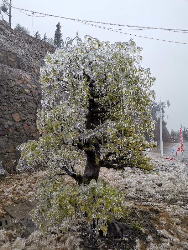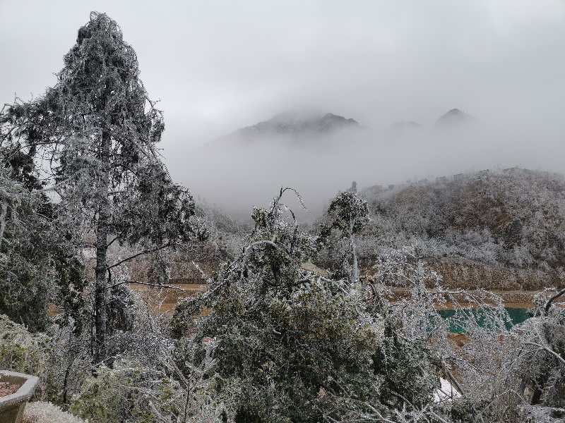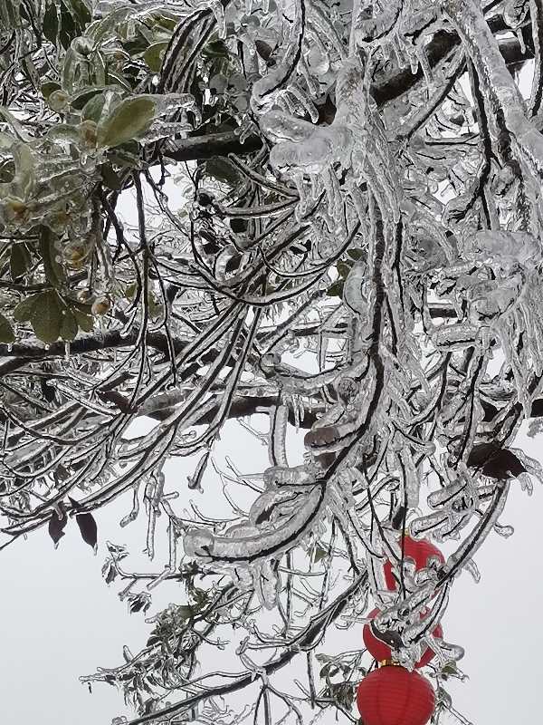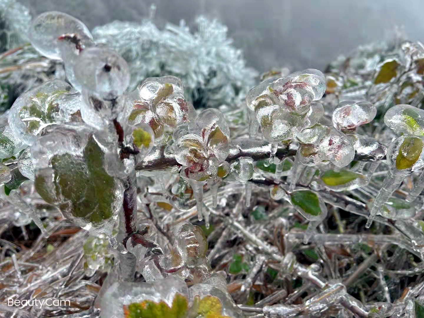 近三天来,韶关新丰县寒冷天气持续,高寒山区最低气温-1到1℃,局部伴有大雾、冻雨,在当地黄磜镇,雨后的山林,花草树木都覆盖上一层层厚厚的冰雪纱衣。