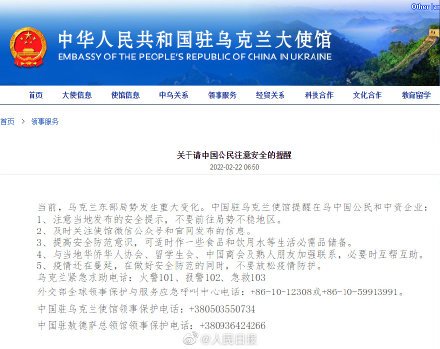 当前,乌克兰东部局势发生重大变化。中国驻乌克兰使馆提醒在乌中国公民和中资企业:①注意当地发布的安全提示,不要前往局势不稳地区;②及时关注使馆微信公众号和官网发布的信息;③可适时作一些食品和饮用水等生活必需品储备;④与当地华侨华人协会、留学生会、中国商会及熟人朋友加强联系,必要时互帮互助;⑤不要放松疫情防护。