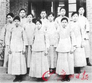 翻开上世纪20年代广州一些教会中学的老照片,里边的女孩子一洗铅华,昔日西关小姐必戴的金簪珠钏全消失不见,上身的大襟袄长不过臀,腰身窄小,喇叭形的袖子中露出纤纤素腕。在早期的老照片,黑色的裙子大多长及脚踝,随着时间的推移,裙子渐渐变短,有的不过略盖过膝盖,大胆地露出小腿。