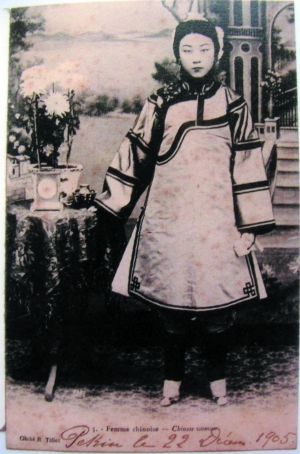 当时外国人拍摄的老照片。照片反映了清末女子服饰。(来源:信息时报)晚清西关小姐的衣饰给人最深刻的印象,便是装饰繁复、雍容华贵。衣襟、袖口和领子都有滚边镶嵌刺绣,上面的花鸟图案无不栩栩如生,精致夺目,据说这种镶滚刺绣工艺是以道数越多越为富丽的,在外销画上,身着“几镶几滚”的华服,裙摆处还点缀着流苏飘带的西关小姐并不少见。让人讶异的是,这些画作的主角似乎是衣服,而不是人。画上的女孩子表情大同小异,宽大的长衫长裙更是深深藏起她们的身体。本来嘛,按照传统的审美标准,女子总以贞静为美,削肩、细腰和平胸是王道,就算是知书达礼的西关小姐,也得努力成为“看不见的人”,才算成功。