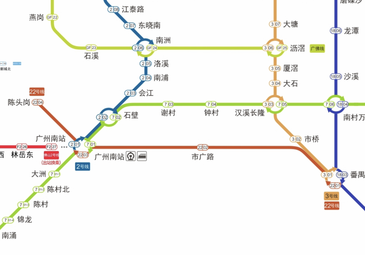 广州地铁22号线设计时速160公里,是18号线的姊妹线。22号线首通段全长约18.2公里,自北向南设有4座车站:陈头岗、广州南站、市广路、番禺广场。其中,广州南站可换乘广州地铁2号线、7号线、佛山地铁2号线,番禺广场站可换乘广州地铁3号线、18号线。