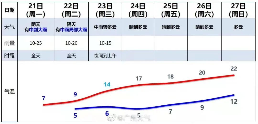 冷冷冷!这几天的天气比春节假期还要冷!阴雨寒冷天气还将持续,23号逐渐停雨转多云天气。据@广州天气,预计21-22日白天降水减弱转小到中雨,22日夜间雨势再度加大至中雨,低温阴雨持续,气温介于5~9℃之间,广州市寒冷橙色预警信号持续生效。23日白天天气转好,24-28日冷空气影响减弱,晴到多云为主,气温逐渐回升。
