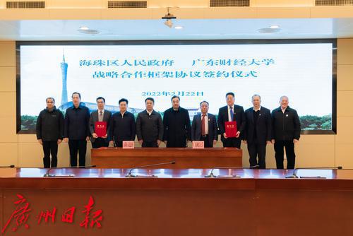为进一步拓宽校地合作领域、建立校地合作长效机制,共同推动海珠区经济社会高质量发展和广东财经大学大湾区一流财经大学建设,2月22日上午,海珠区人民政府与广东财经大学战略合作协议签订仪式在区机关会议中心举行,携手拉开了共建共荣、共享共赢的校地合作发展新篇章。