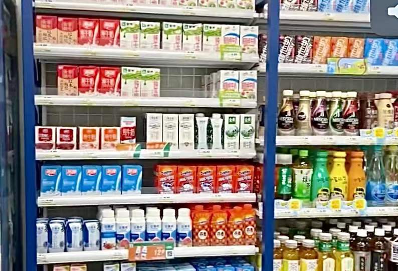 (燕塘牛奶和其他产品一起陈列在货架上)