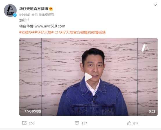 據了解,劉德華的粉絲官網「華仔天地」以「加油!」為題發佈了相關視頻,「華仔天地」的官方微博賬號也轉載了相關視頻。