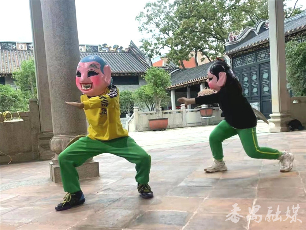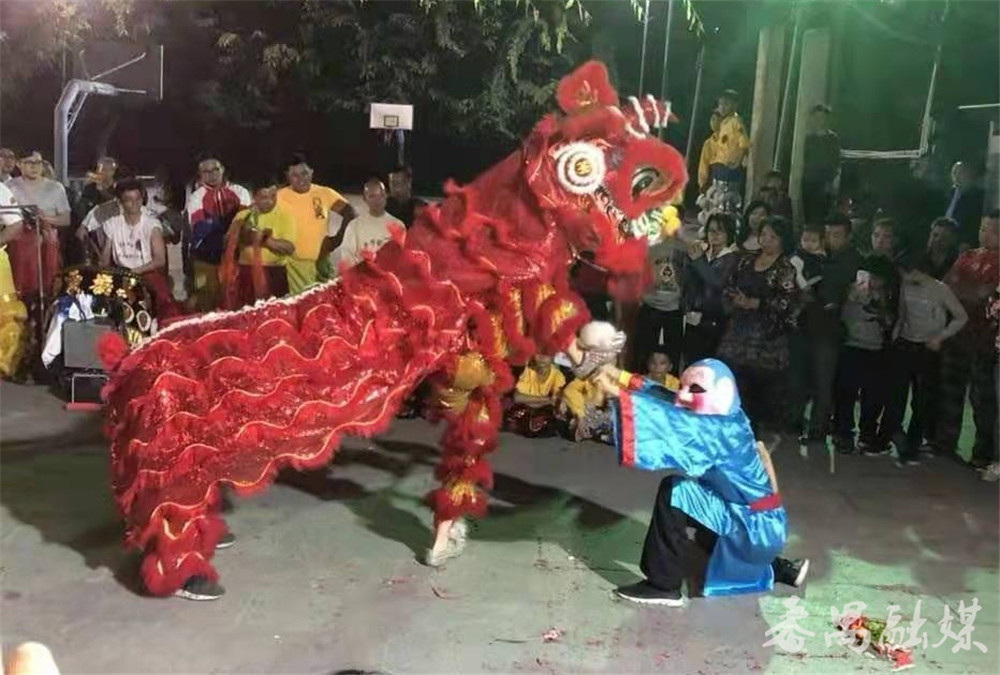 新桥村大头佛表演传承人周珠仔师傅在桥山村进行大头佛与醒狮的联合表演